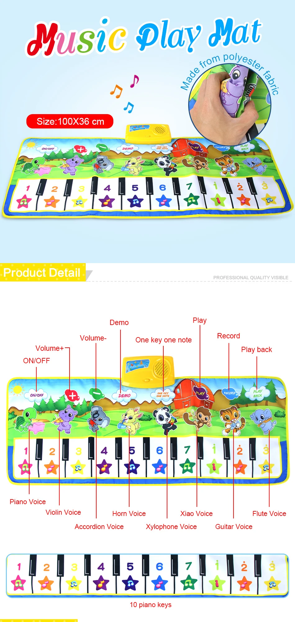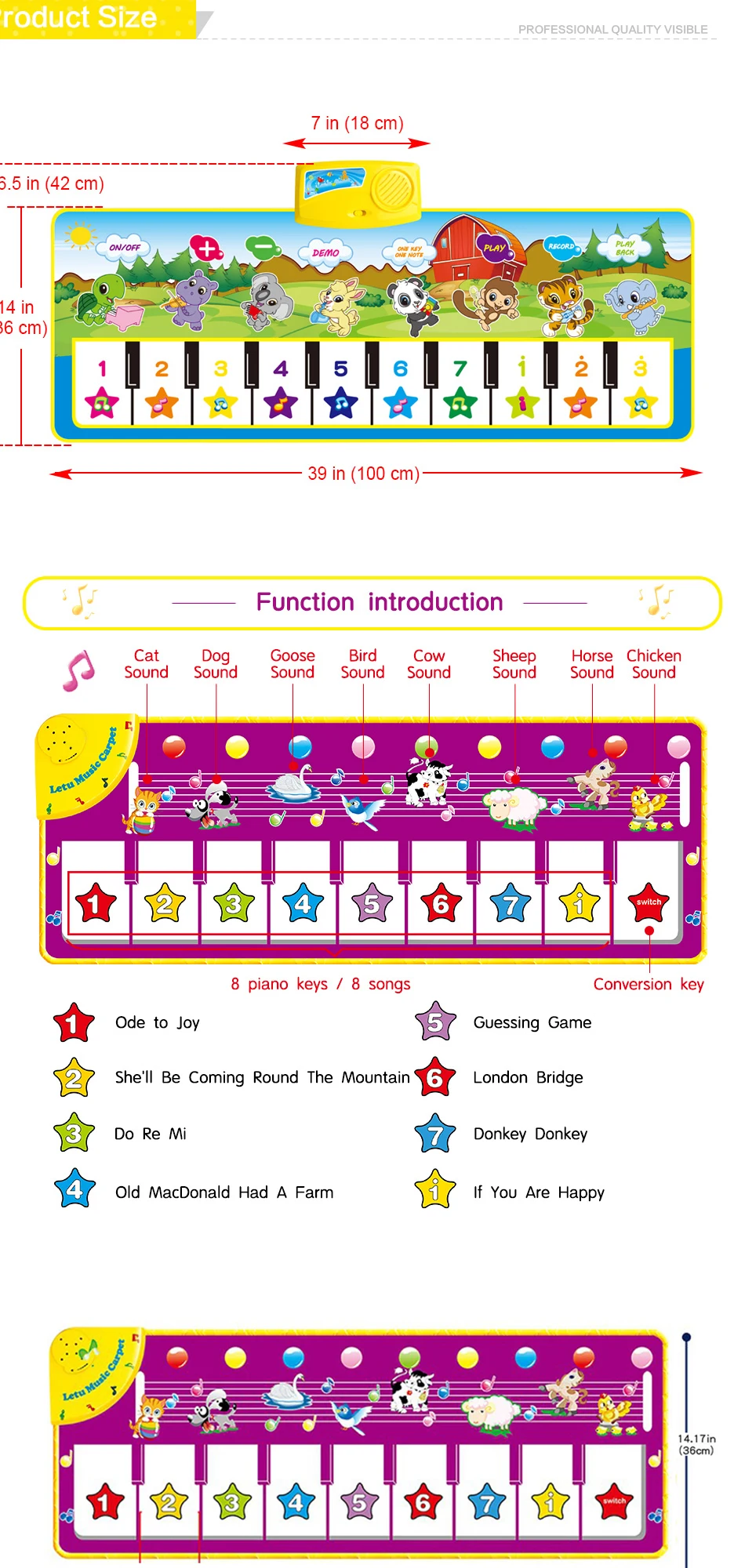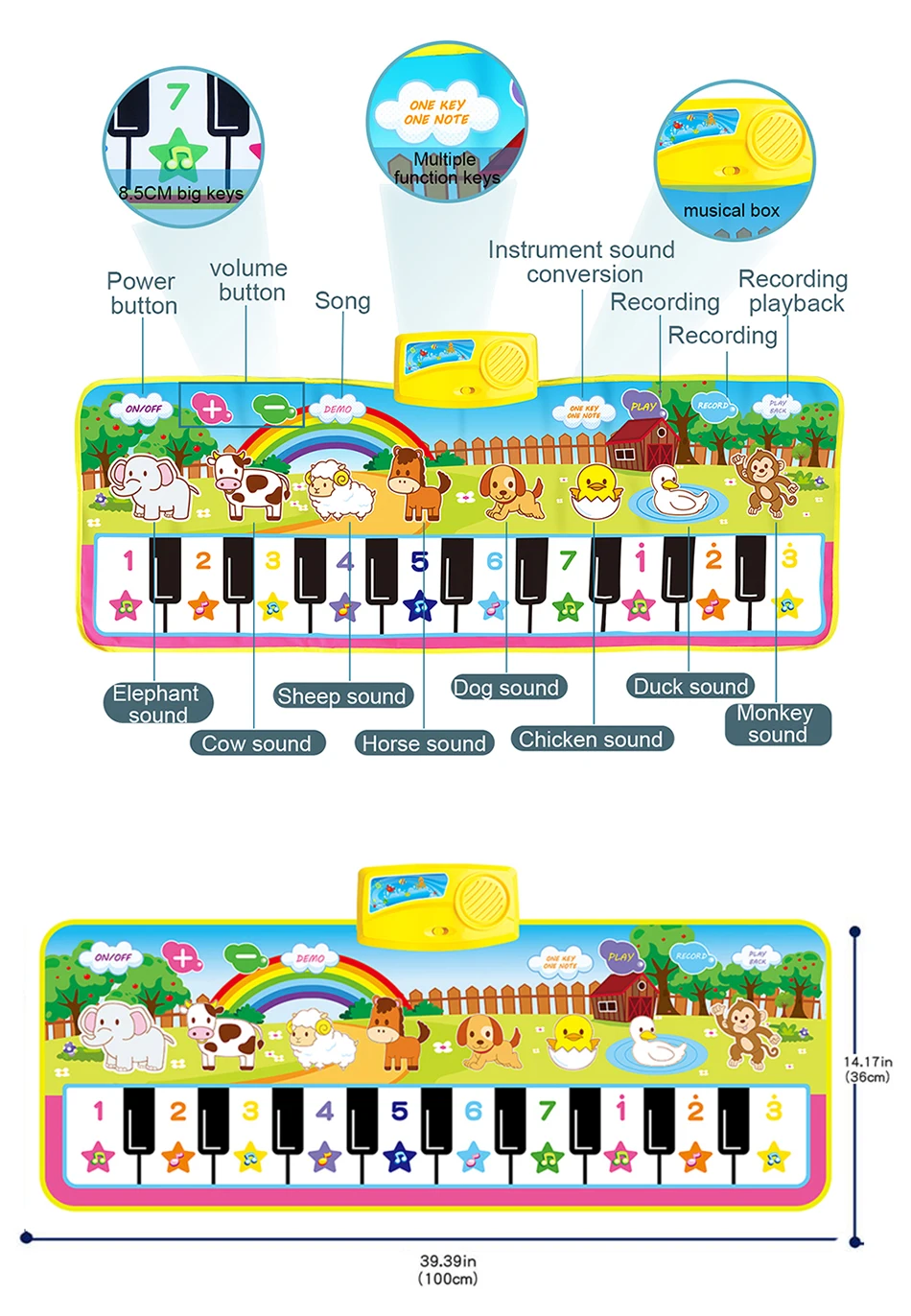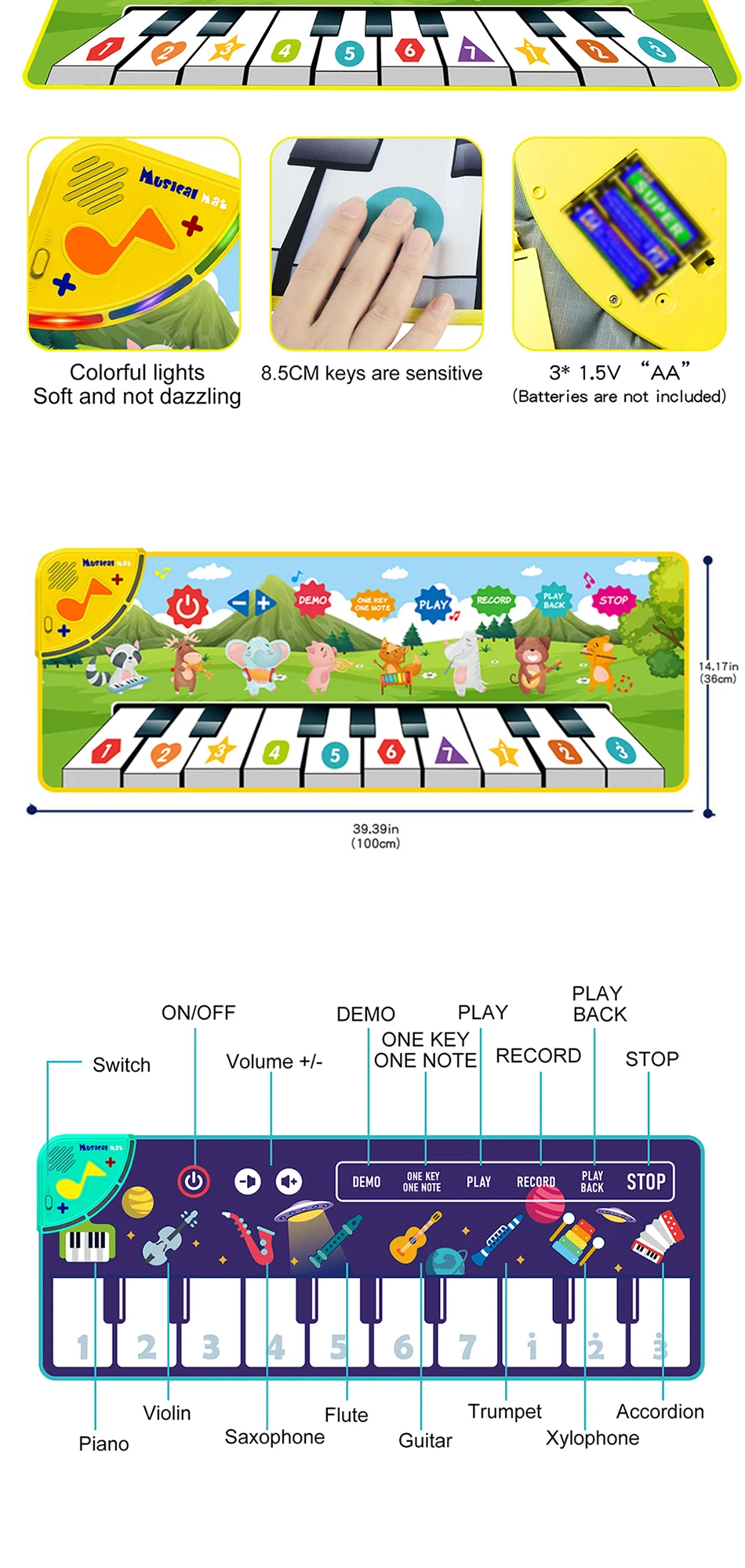 Совершенно новый, высококачественный и экологически чистый материал для детей. Размер: 100x36 см, достаточно большой для 2-3 детей, играющих вместе. Требуется 3 батарейки типа «АА». (не входят в комплект) милая тема с животными, которая легко понравится вашему ребенку. Многофункциональная Поддержка различных видов игр. Дети не только будут развивать свой музыкальный интеллект, но и получать чистое удовольствие через этот коврик.