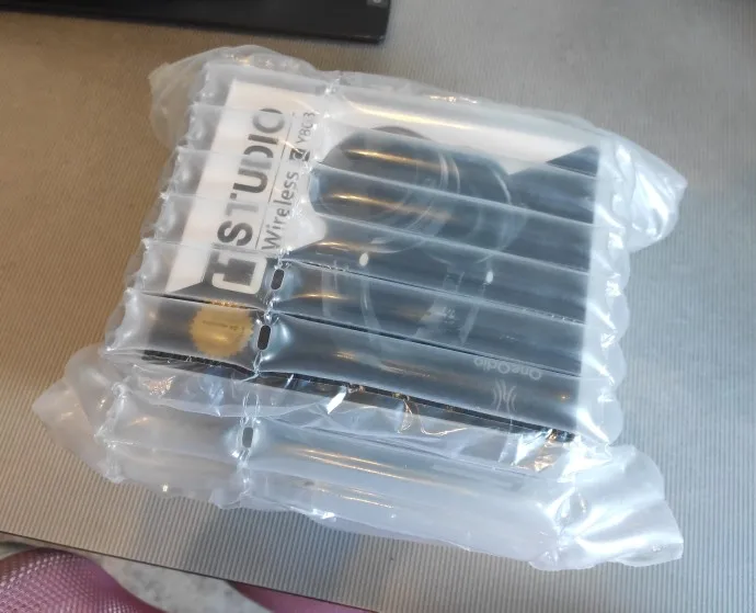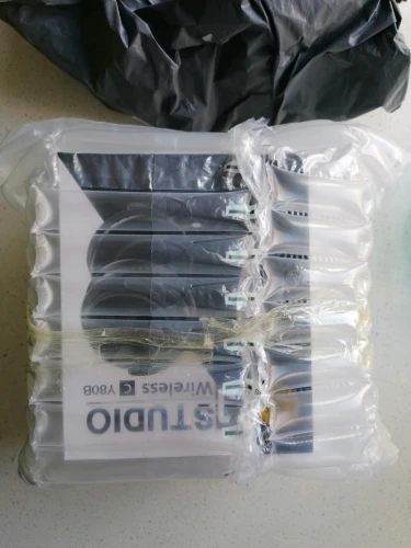 Доставка за три недели. Упаковано очень хорошо - в трубки, наполненные воздухом. Коробка немного помялась, но наушники дошли в целости и сохранности. Упаковка не подарочная - коробка из тонкого картона с чёрно-белой картинкой. Звук и по блютуз и по проводу присутствует. Мои уши не уловили различия между проводом и беспроводом. В целом - что хотел, то и получил.