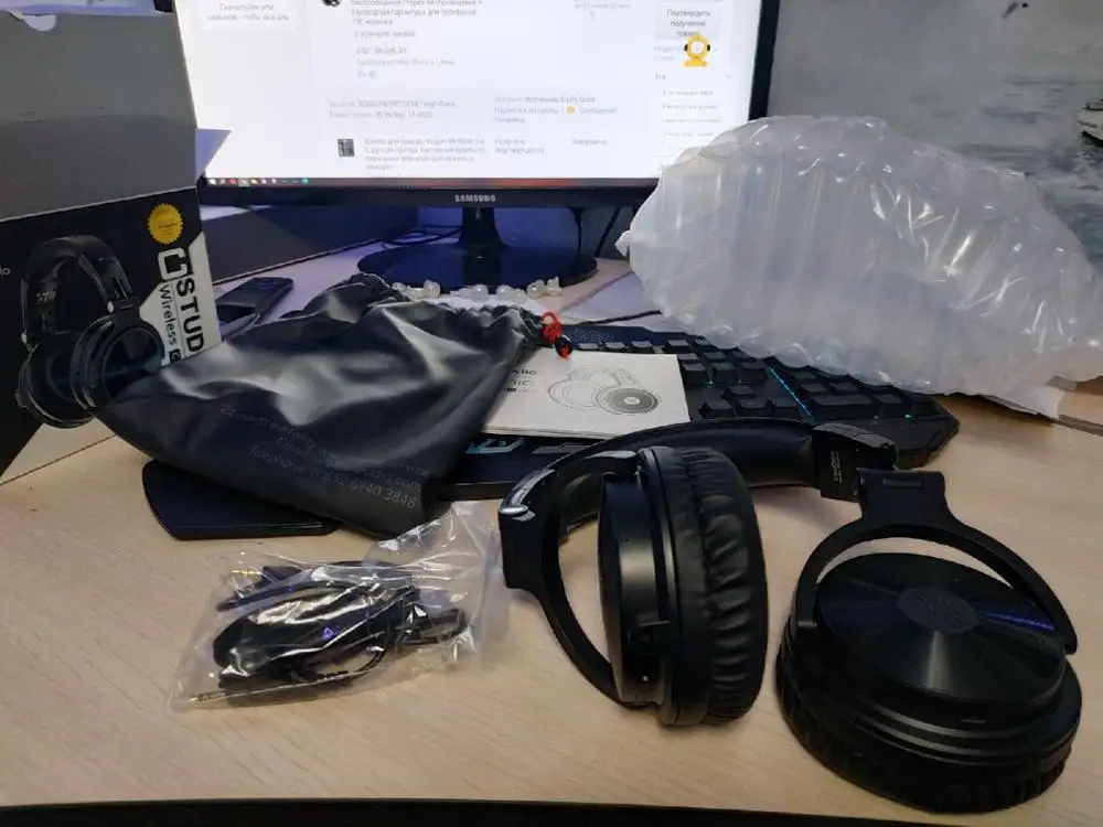 Упаковка хорошая, воздушный пакет. Но наша почта умудрилась даже через такую упаковку помять коробку. Наушники пришли целые, заряженые, подключились сразу, играют громко, у меня нет музыкального слуха, поэтому я доволен, брал из-за объема батареи. Обещают 80 часов игры, посмотрим как оно будет. Планирую слушать аудиокниги в течении всего рабочего дня. Оголовье - прошитый кожзам. Амбюшуры круглые, мягкие но на мое ухо приходится его туда впихивать, какие будут ощущения спустя 8 часов ношения - напишу позже, так достаточно тугие, держат хорошо. В комплекте шнур Джек 3.5 и кабель зарядки Микро-ЮСБ, Чехол из кожзама и инструкция