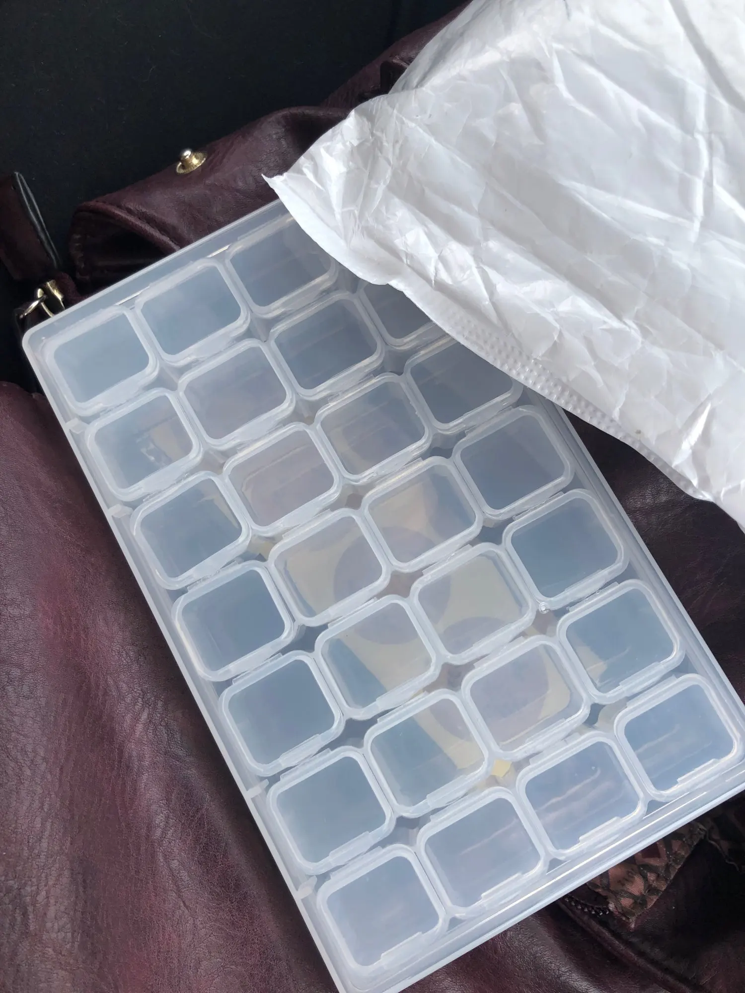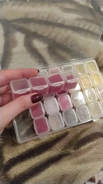 Идея отличная - коробочки для мелочей в коробочке побольше. Рай для перфекциониста)) Заявлено, что органайзер предназначен для хранения материала для алмазной вышивки, однако маленькие коробочки имеют достаточно большие зазоры (крышка не прилегает плотно). И открываются почти все с огромным трудом. Есть риск все рассыпать, пока будешь открывать. Доставка до Москвы за 9 дней.