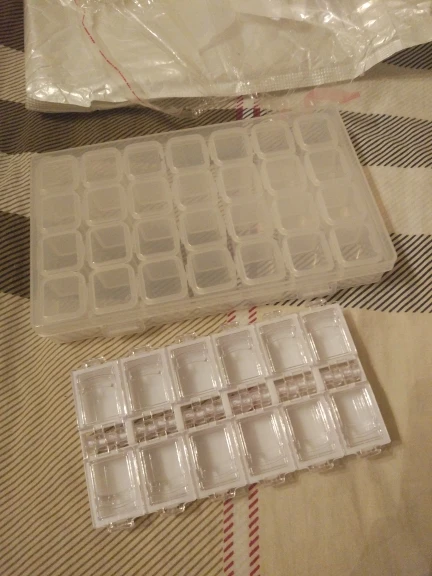 Пришел через месяц, ничего не сломано. Отлично подходит для алмазной живописи. Сначала кажется немного слишком маленьким, но подходит для 4 алмазных мешков (200 шт. * 4). Сначала немного сложно открыть, но Привыкните к этому.