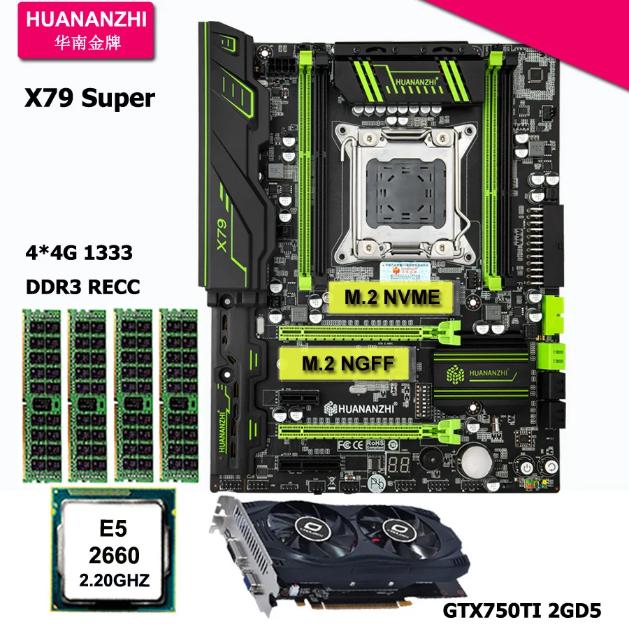 HUANANZHI X79 супер материнская плата с двумя M.2 слот + Ксеон E5 2660 C2 2,6 ГГц Процессор + 4*4G DDR3 REC + Б/у видеокарта GTX750TI 2GD5 + кулер адаптер + кабель SATA + металлический задний щит + диск драйвера + Руководство пользователя