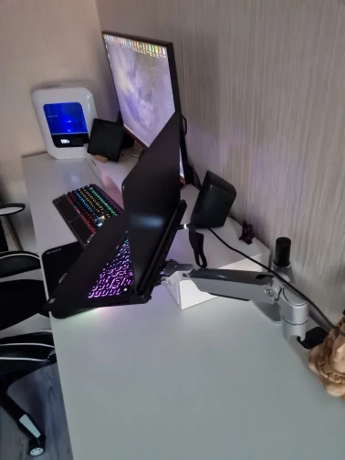 Вещь основательная. Свою цену отрабатывает на высший бал. Но что сразу бросается в глаза. Силиконовых резинок меньше и не по всей площади захватов для ноутбука. Очень похоже, что можно поцарапать ноутбук. Так же, на весу набирать комфортно не получится, даже если все затянуть, подставка все равно гуляет. Колено на штырь садится не плотно и гуляет.