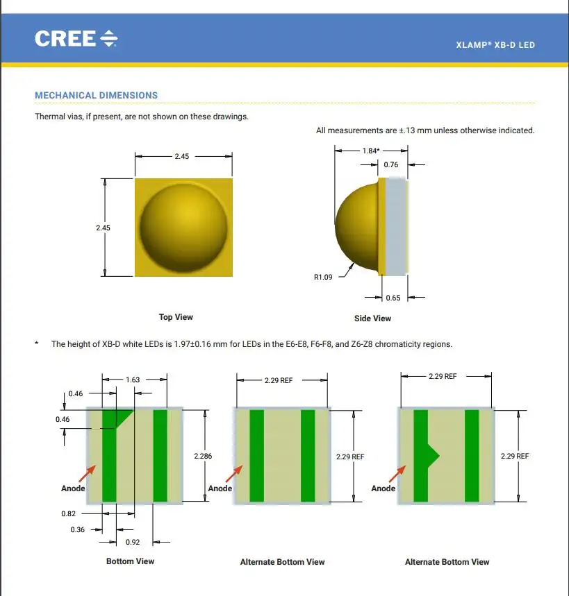 XLamp XB-DНаименьший светодиодный освещения позволяет значительно снизить стоимость системыРазработан для снижения затрат на систему для производителей освещения, XLamp®XB-D светодиодный Дов удваивают люмен на доллар от ранее доступсветодиодный Дов. Построен на технологии Cree SC³™Платформа, XB-D белый светодиод обеспечивает до 139 люмен и 136 люмен на ватт в холодном белом (6000 K) или до 107 люмен и 105 люмен на ватт в теплом белом (3000 K), при 350 мА и 85 °C.Цветные светодиоды Cree XLamp XB-D обеспечивают двойную светоотдачу в расчете на доллар в упаковке XB до цветных светодиодов, что обеспечивает максимальную светоотдачу до 40% выше, чем у цветных светодиодов XP-E. Сочетание производительности и небольшого размера XB-D цветных светодиодов позволяет улучшить смешивание цветов и снизить стоимость системы.Размер 2,45x2,45 ммВарианты цвета излучателя:Холодный белый 6500-7000KТеплый белый 2900-3200KНейтральный белый 3900-4500KКрасный 620-630 нм Янтарный 5850-595нмСиний-нм зеленый-нмПрямое напряжение DC:2,9-3,5 в (белый)3,1-3,7 в (синий)3,3-3,9 В (зеленый)2,25-2,6 В (красный/янтарный) Максимальный ток привода 1 АМаксимальная мощность (W) 3 ВтМаксимальная светильник вая мощность (лм) 309 лм (белый) 39,8 лм (синий) 114 лм (зеленый) 80,6 лм (янтарный) 67,2 лм (красный)Максимальное обратное напряжение-5 ВУгол обзора 115Посылка: 100 шт цвет как заказано