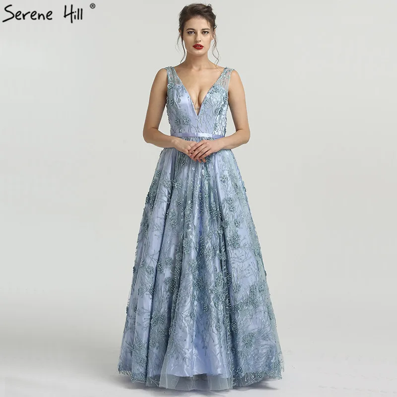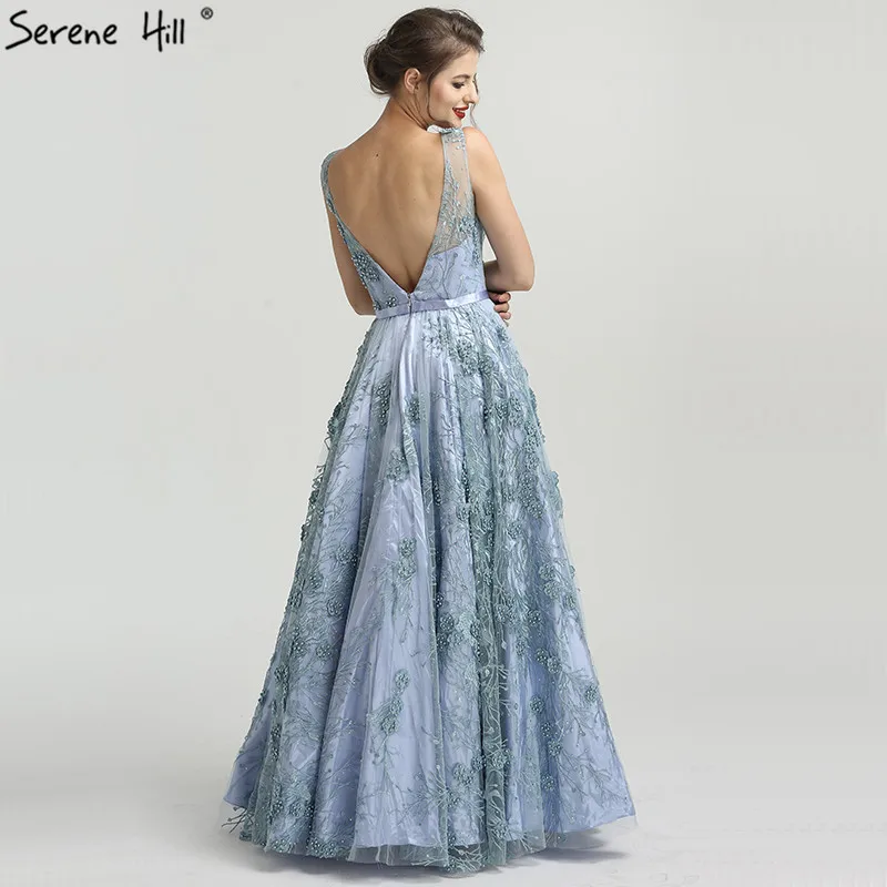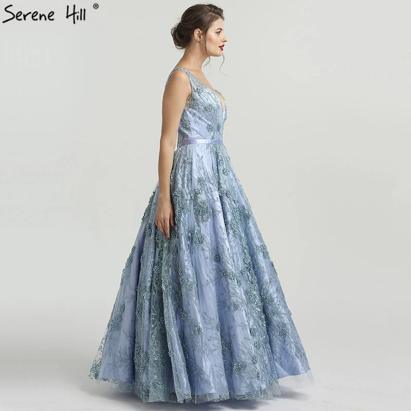 Синее ТРАПЕЦИЕВИДНОЕ длинное Тюлевое привлекательное кружевное официальное вечернее платье Serene Hill 2022 BLA6482
