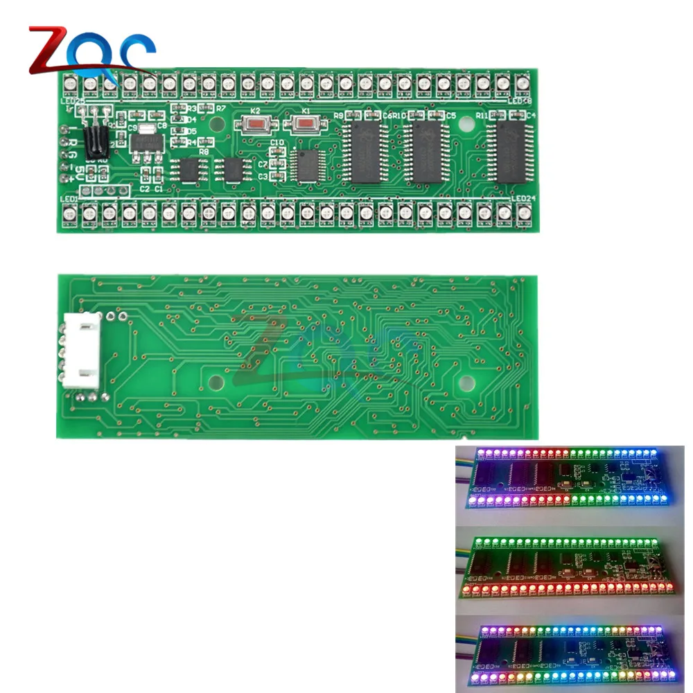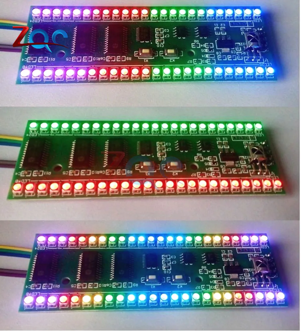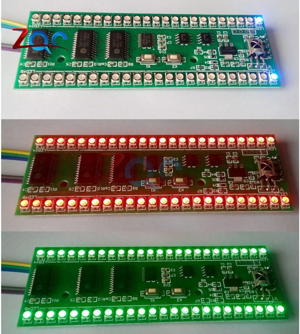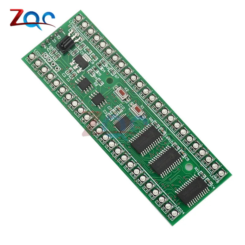 Описание:С использованием трех цветов SMD светодиодный, красочный, цвет гибкой конфигурации, сборные различные цветовые схемы, может установить цветовую схему, специфический цвет каждой точки, есть различные дизайн может выбрать, можно регулировать яркость, чувствительность регулируется, можно настроить инфракрасный пульт дистанционного управления, удобное Самообучение, (Вам нужно подготовить инфракрасный пульт дистанционного управления самостоятельно, поддерживает только тогда/E/C, этот формат более распространен, можно взять домой попробовать телевизор, телеприставки, Я возвращаюсь домой в девять приемников дистанционного управления, дистанционного управления, haier TV Tmall magic box пульт дистанционного управления и отходы VCD дистанционного управления тест может быть использован, Пульт дистанционного управления для домашних электрических вентиляторов и кондиционер, пульт дистанционного управления, тест не может использоваться).Размер: 100 мм x 35 мм x 12,5 мм (Д * Ш * В)Установленное расстояние отверстия: 52 ммОтверстие Диаметр: 3,2 мм(Обратите внимание, что вокруг монтажного отверстия предпочтительнее использовать изолирующая прокладка)Источник питания: 5-6 в/250 мА постоянного тока(Максимальный ток-это светодиодный индикатор и высокая яркость, обычно менее 100 мА)Звуковой сигнал: Возьмите три линии на разъеме для наушников, соответственно, это сигнал заземления (вместе с мощностью платы отрицательный), левый канал, правый канал.После включения, на самом деле внутри каждого светодиодный индикатор красный, зеленый, синий три разных цвета светодиодный интегрирован вместе, в дополнение к обычному дисплею красный, зеленый, синий три цвета, красный и зеленый могут смешать желтый, красный и синий могут смешать пурпурный, зеленый и синий могут смешать голубой. На самом деле, если у вас есть более близкий вид, вы можете увидеть различные цвета светодиодных внутренних огней, изображение не может вынуть этот эффект, Два Цвета смешаны в цвет, близкий взгляд на фактический эффект не лучше, чем на фото, на дальнем расстоянии, чтобы увидеть тот же эффект.Функциональное состояние и функции кнопок:Две кнопки K1 и K2, нажмите короткое нажатие и удерживайте два типа.Следующее заявление, если не специальное, говорит, что нужно Длительное нажатие, это означает короткое нажатие.1. Состояние отображения уровня:После включения питания уровень автоматически отображает яркость, рисунок, цветовую схему и чувствительность последнего состояния отключения питания.Это состояние функции кнопки:K1/выберите шаблон, кликните по узору, узор в конце цикла с самого начала.K1 нажмите и удерживайте кнопку, чтобы войти в режим выбора цветовой схемы (Обратите внимание: кнопки снизу вверх с рисунком излучения на длинном нажатии, чтобы войти в режим инфракрасного обучения).K2/Чувствительность выберите щелчок изменить уровень чувствительности, заказ является самой высокой чувствительностью ..... Самая низкая чувствительность> чувствительность автоматически возвращается к самой высокой чувствительности.K2 длинный пресс/введен в состояние регулировки яркости.2. Регулировка яркости:Левый 24 секции яркий дисплей 8 красный 8 зеленый 8 синий, справа показывает яркость тока (красный), 3 штуки в соответствии с классом 1, Toatl класс 8.В этом состоянии функции кнопки:K1/нажмите на более вы