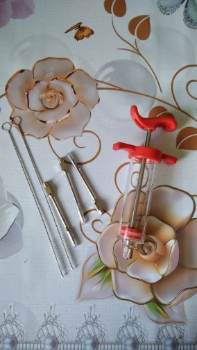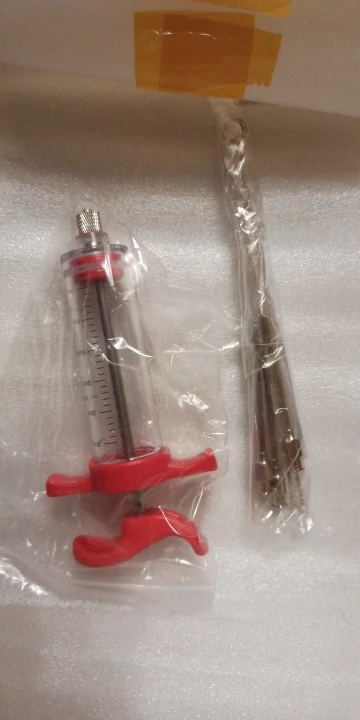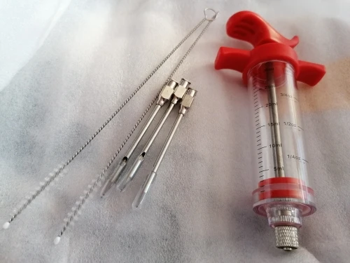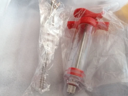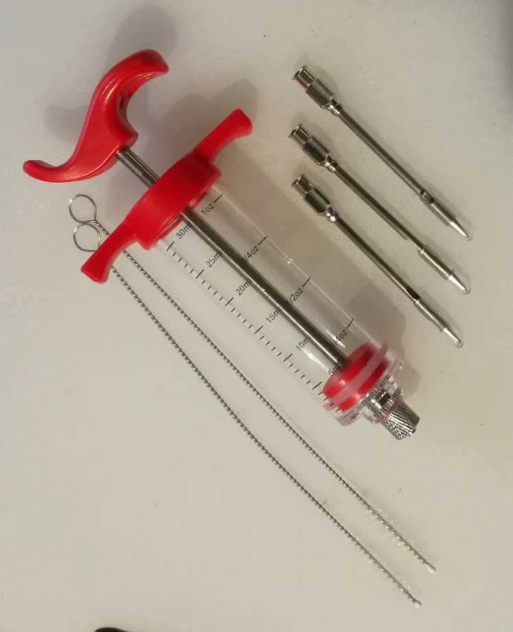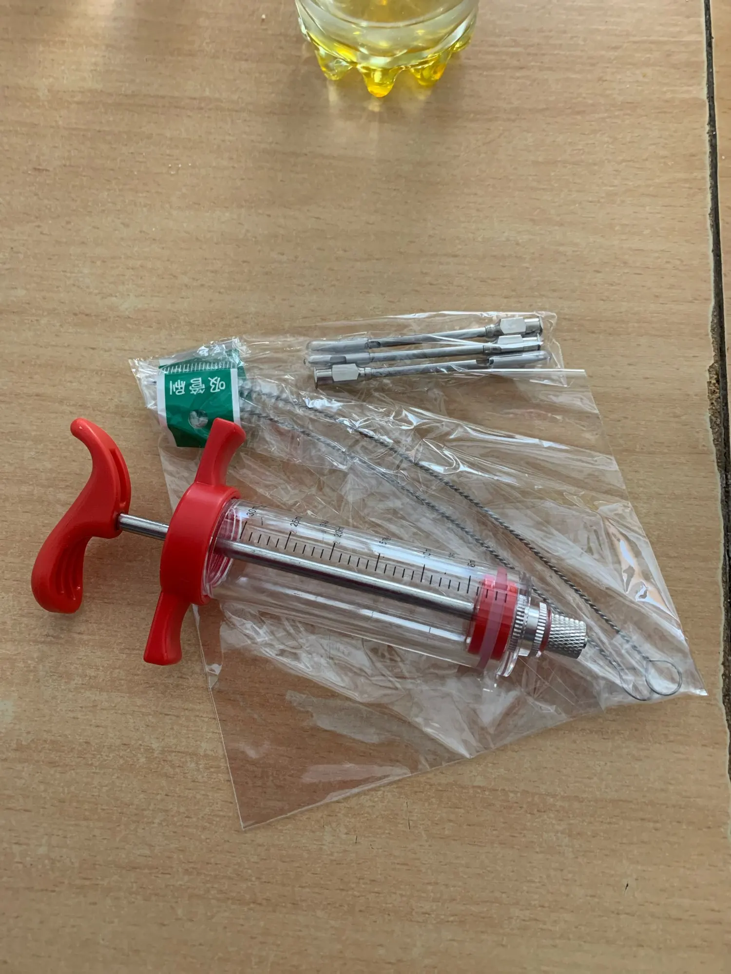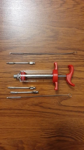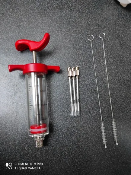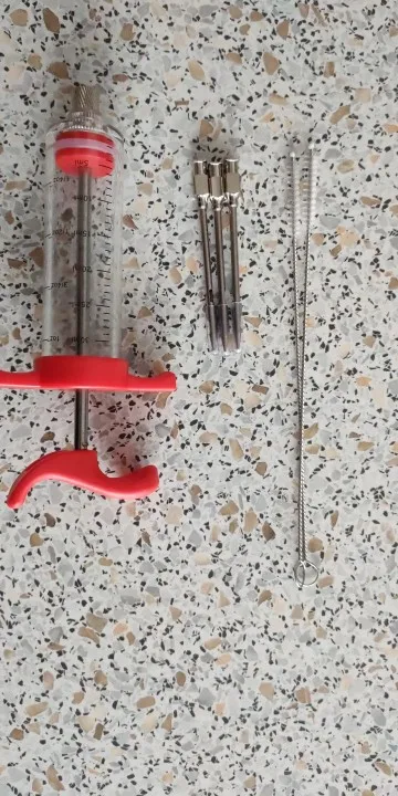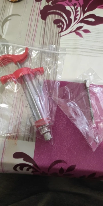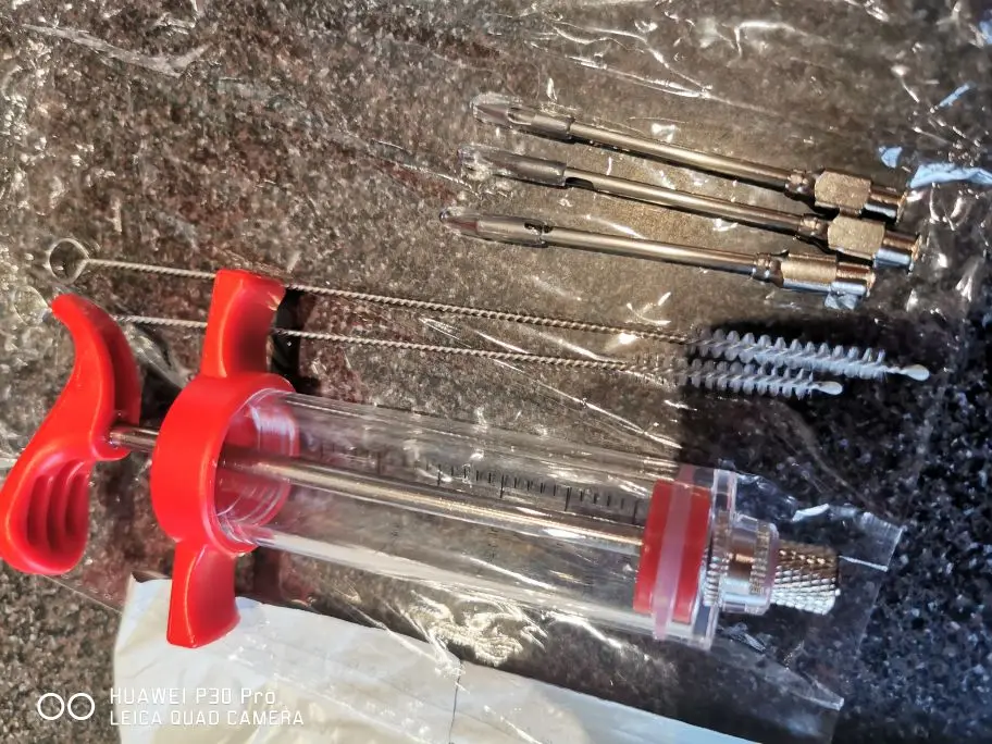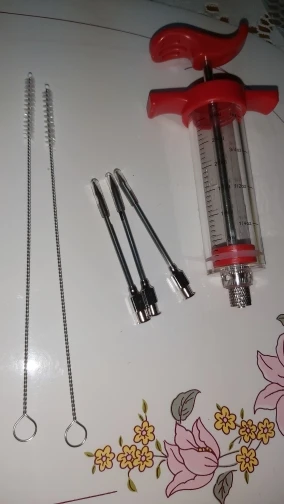 Arrived In Two weeks. Это так же, как описание. Хороший размер и хорошо сделано. Принесите три иглы из нержавеющей стали и две зубные щетки для очистки устройства. Это очень полезно, а не только для мяса, а также для инъекции жидкостей в бигуди и тортов. Это было очень хорошо упаковано.