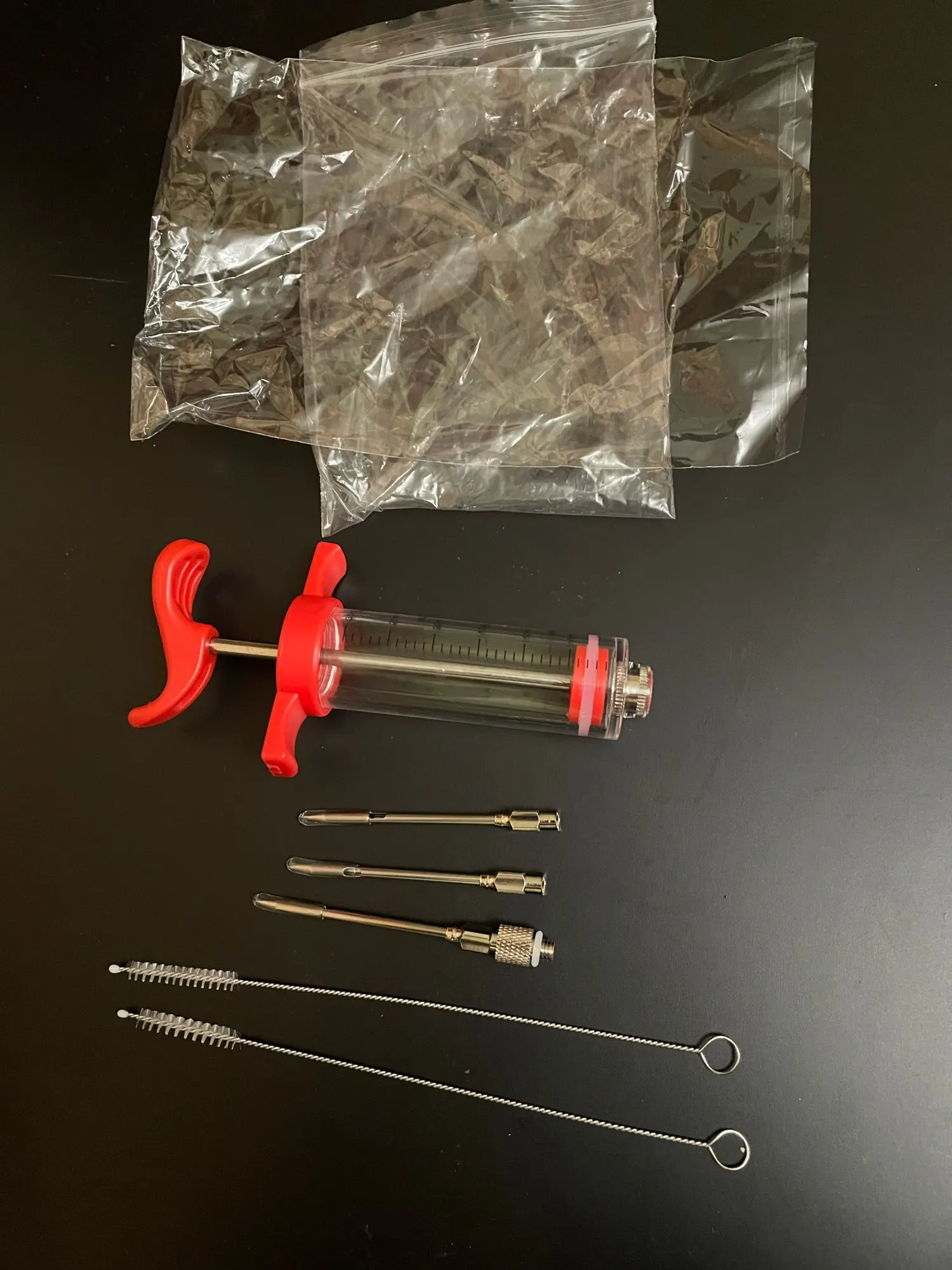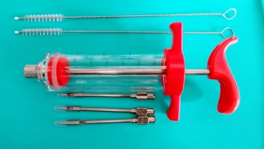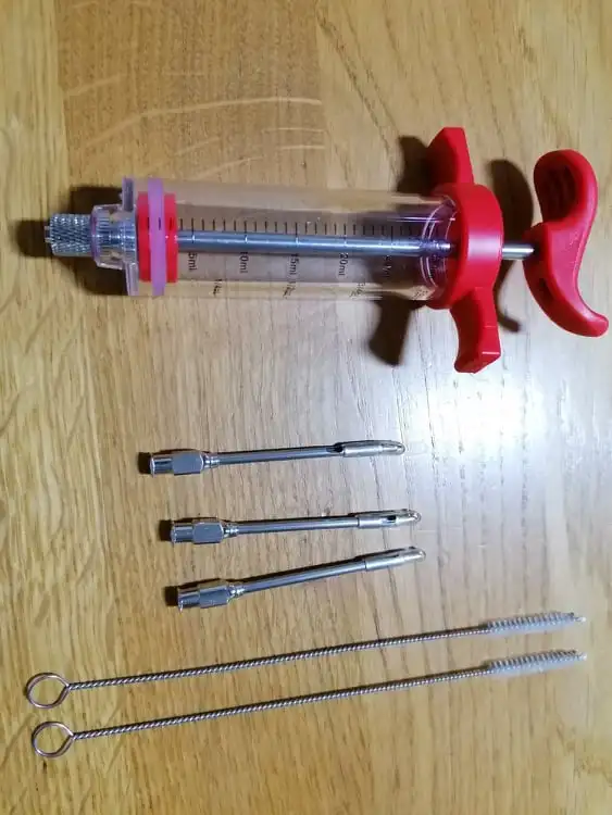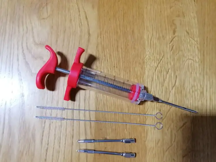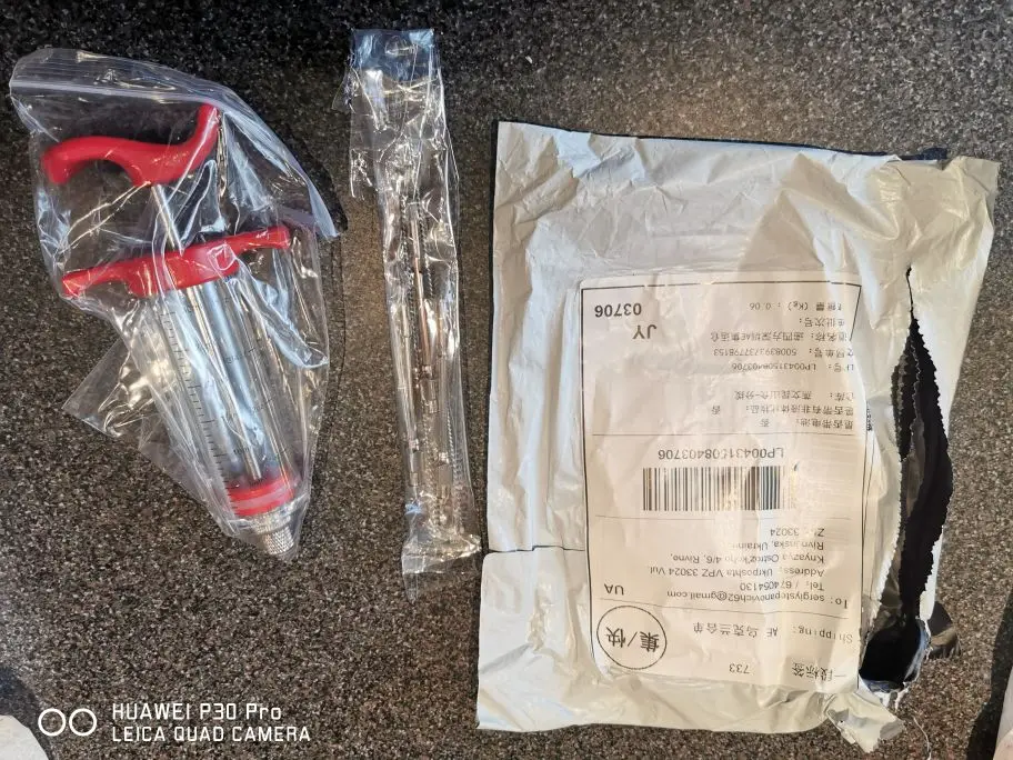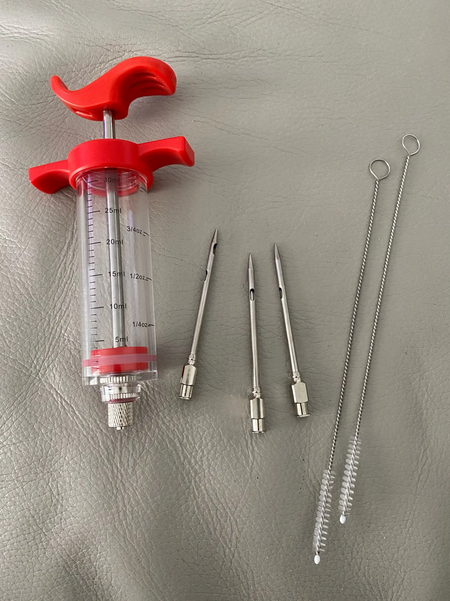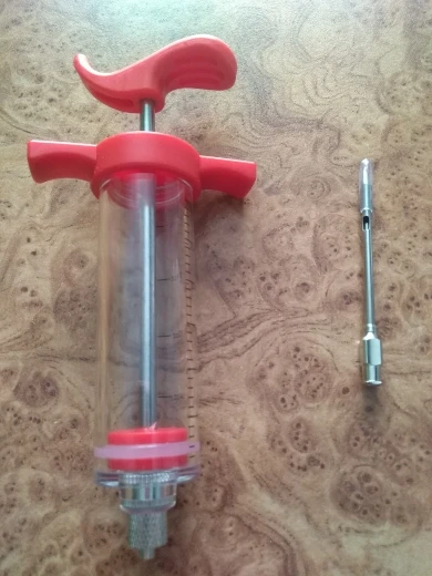 Arrived In Two weeks. Это так же, как описание. Хороший размер и хорошо сделано. Принесите три иглы из нержавеющей стали и две зубные щетки для очистки устройства. Это очень полезно, а не только для мяса, а также для инъекции жидкостей в бигуди и тортов. Это было очень хорошо упаковано.