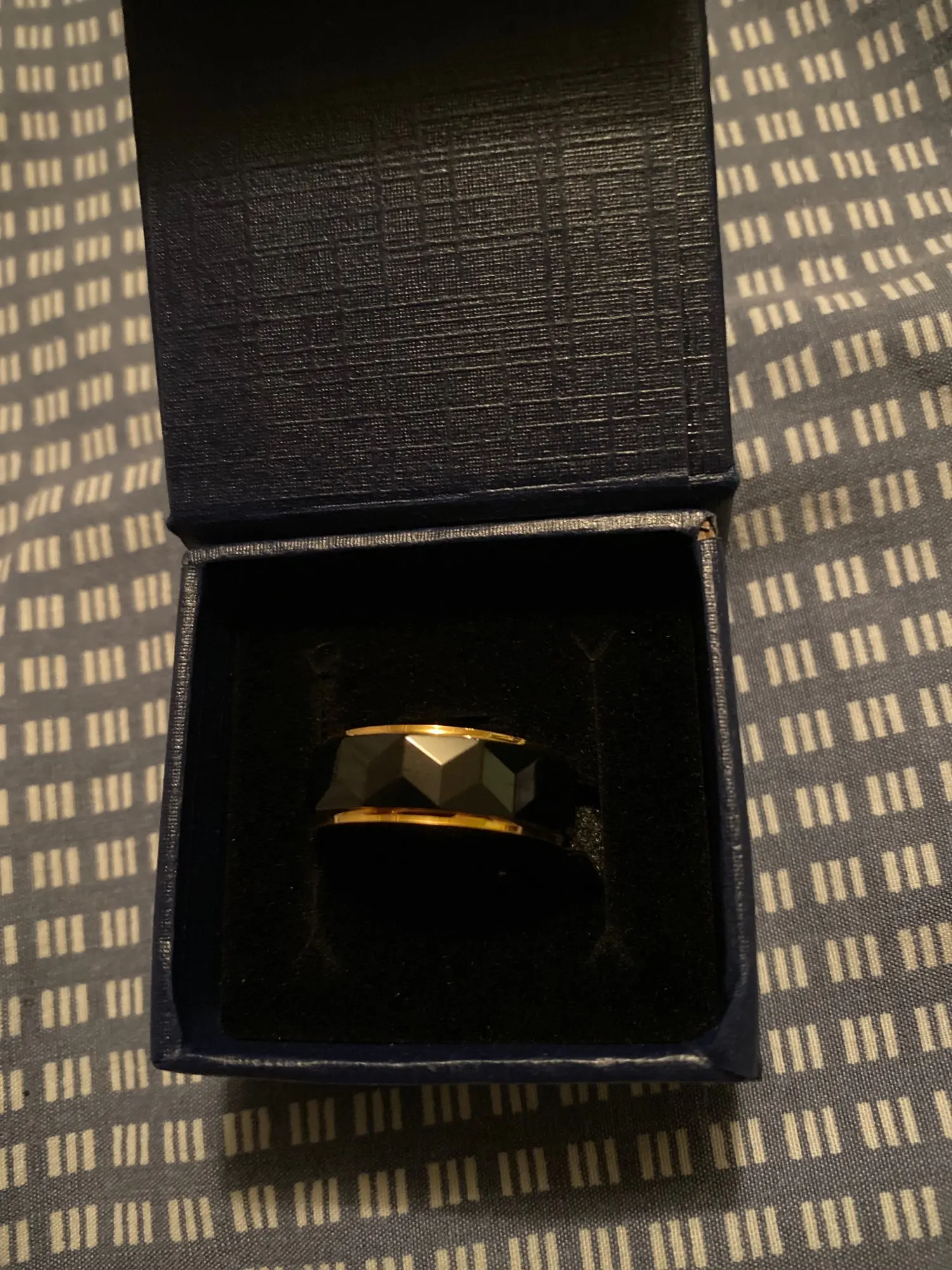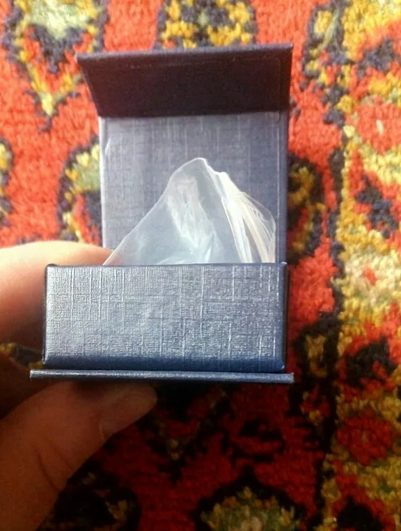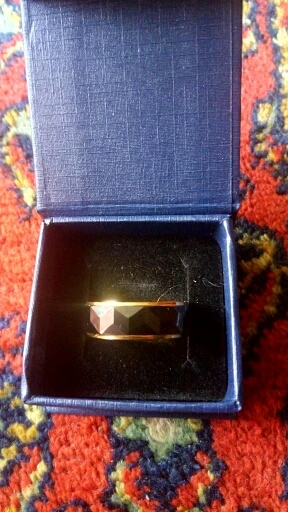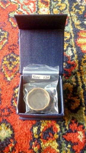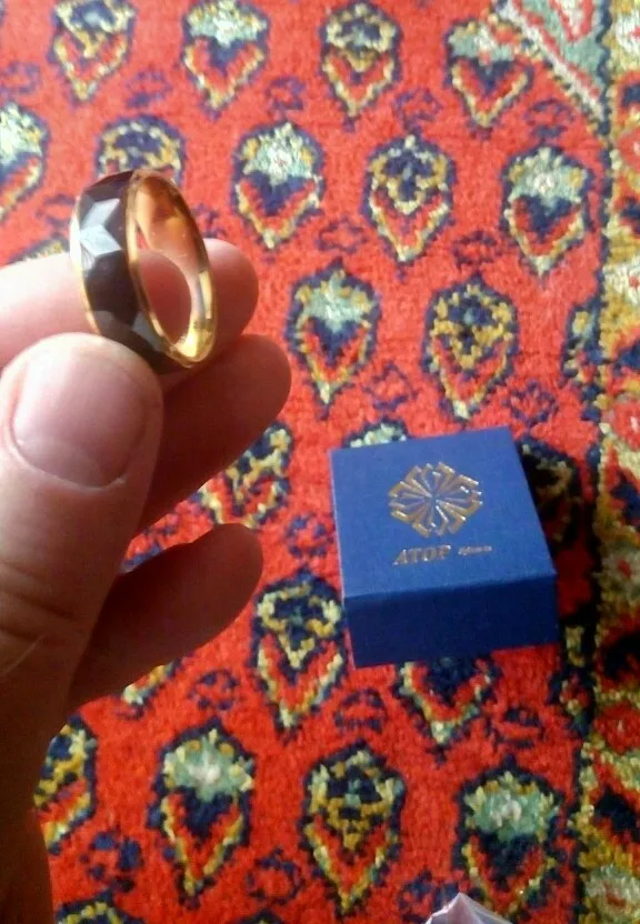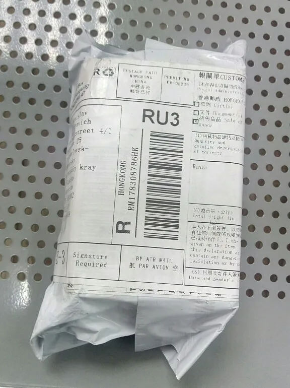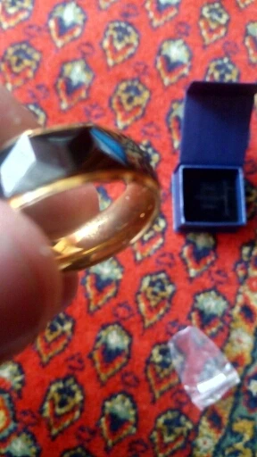 Из Гонконга, через Москву и до Петропавловска-Камчатского мой заказ дошёл за 29 дней, вечером этого же дня я забрал его на почте. Кольцо мне пришло в оригинальной коробочке с логотипом компании, что очень меня порадовало. Продавец отправил его мне на пятый день заказа, мою просьбу выгровировать на внутренней стороне кольца что оно из карбида вольфрама продавец не выполнил, хотя писал мне что просьбу мою выполнит. Ну хоть с размером кольца он не ошибся и выслал 12-ый размер, как я и заказывал. Кольцо мне очень понравилось, на указательным пальце сидит как влитое. Крышка фирменной коробочки фиксируется небольшим магнитом.