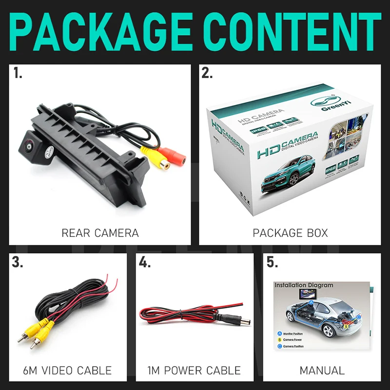 1. Камера заднего вида2. Коробка для посылка3. Видео кабель 6 м4. Кабель питания5. Руководство пользователя