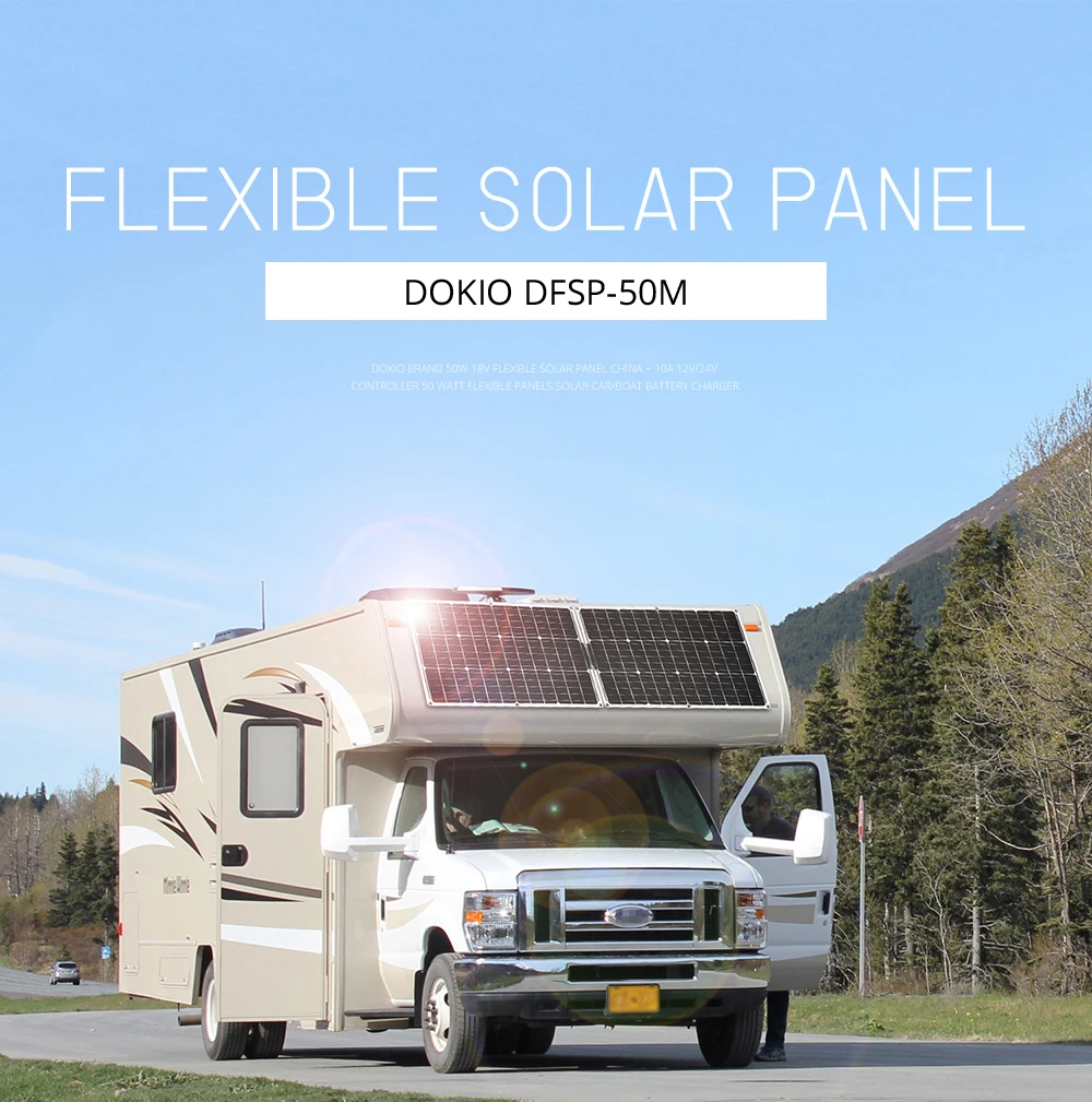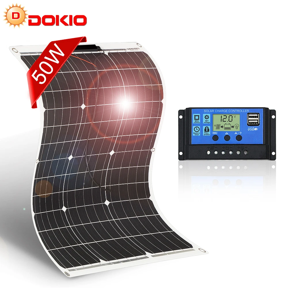 Монокристаллическая Гибкая солнечная панель DOKIO, 50 Вт 18 в, 10 А, 12 В, 24 В контроллер, комплекты солнечных батарей для рыбалки, лодки, кабины, кемпинга