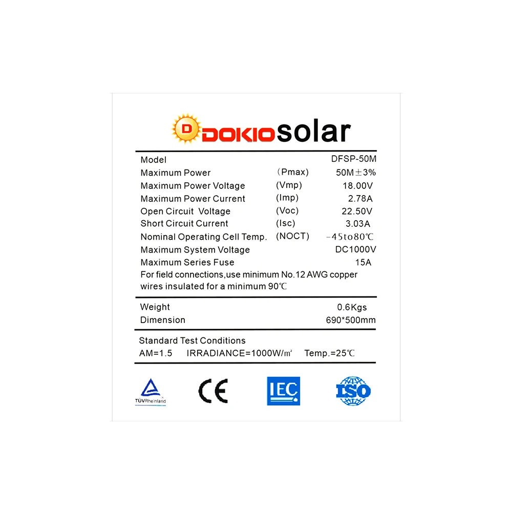 Максимальная мощность (Pmax): 50 ВтМаксимальное напряжение питания (Vmp): 18,00 вМаксимальный ток питания (Imp):2.78AНапряжение открытого замыкания (Voc): 22,50 вТок короткого замыкания (Isc):3.03AМаксимальное напряжение системы: DC1000VМаксимальная серия предохранителей: 15AНоминальная рабочая температура ячейки.(NOCT): от-45 до 80 ℃Вес: 0,6 кгРазмеры: 690*540 мм