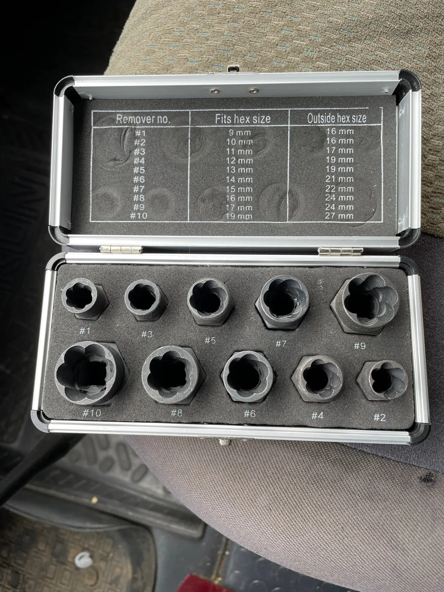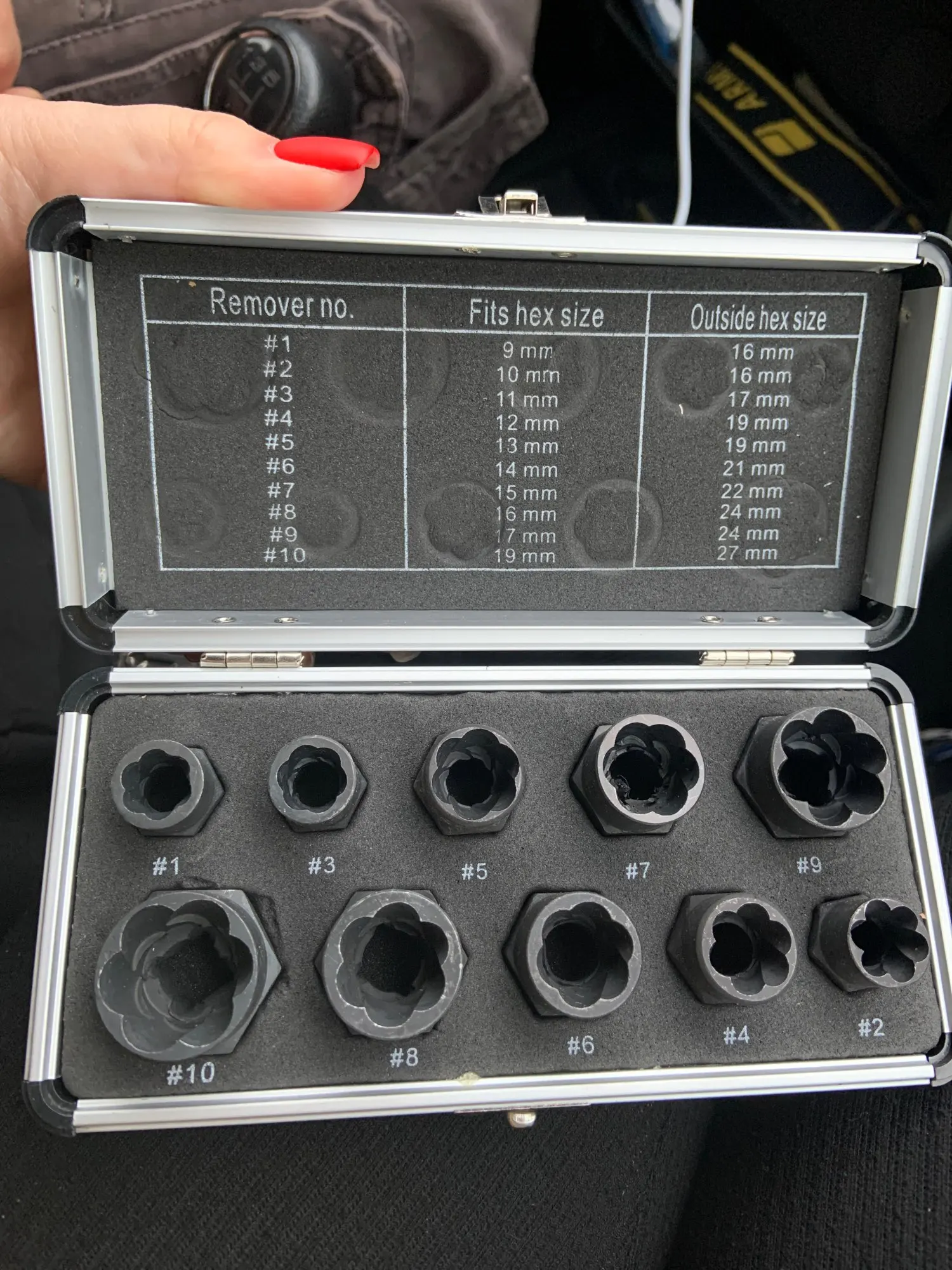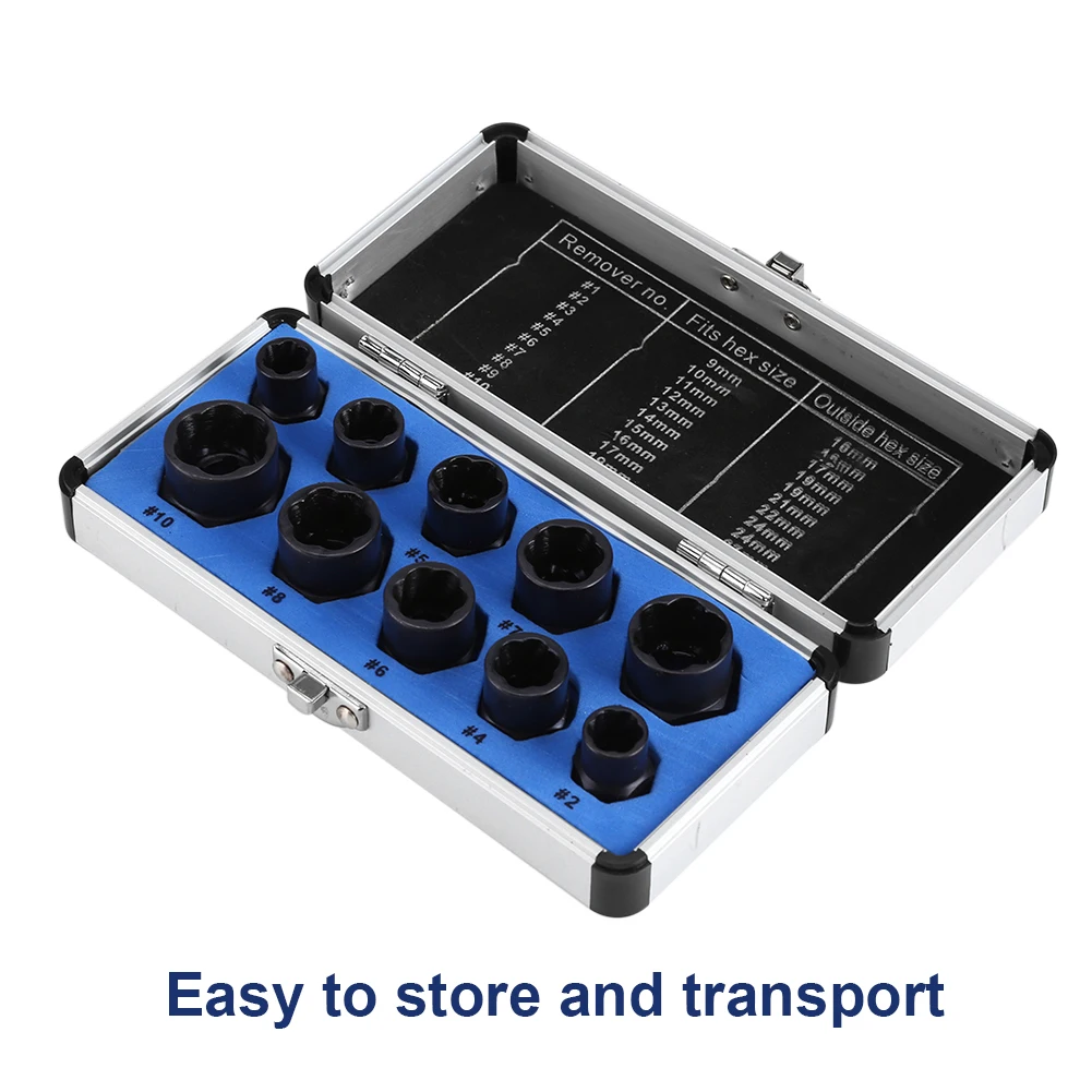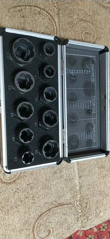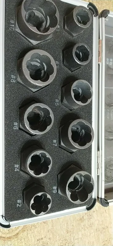 Это набор из 10 прочных инструментов, помогающих удалить гайки, болты, головки винтов, шпильки и т. д.