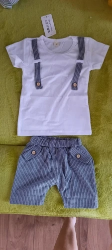 Набор, как видно на фото. Это красиво и удобно. Он прибыл раньше, чем ожидалось. Мне очень понравилась ткань брюк. Плохо то, что шов не очень хороший, и у него было много нитей. Размер 18 месяцев идеально подходит для моего сына, которому 10 месяцев и весит 11 кг