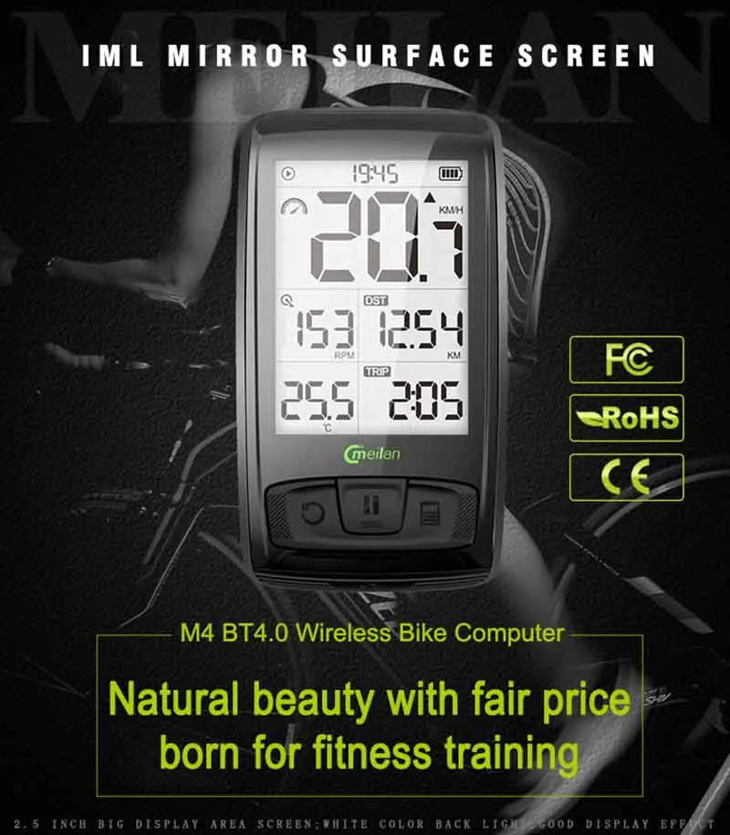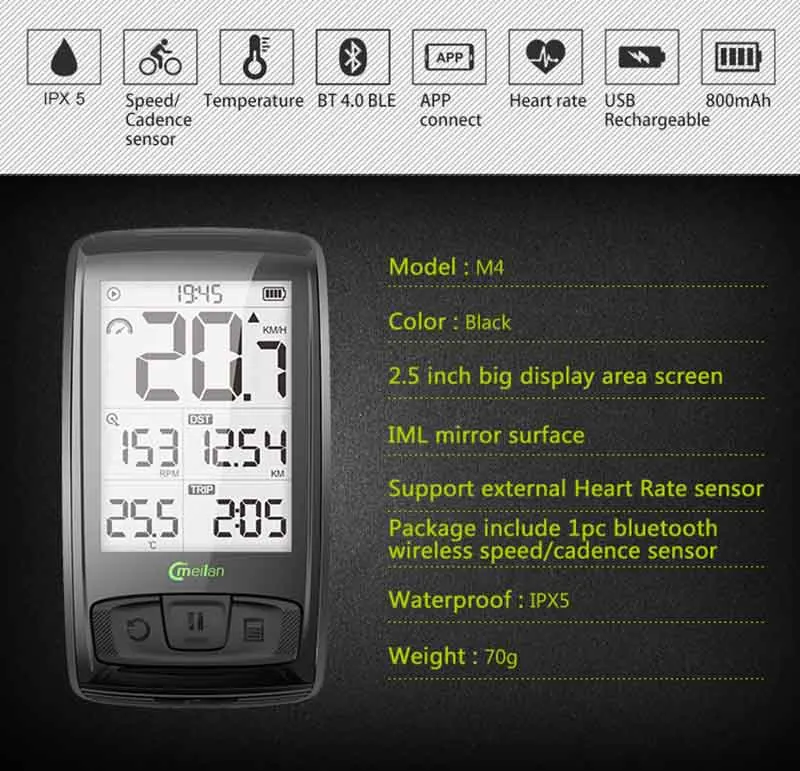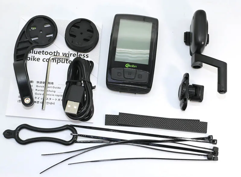1 х велосипедный компьютер Meilan M41 x Беспроводная скорость + частота вращения1 х Подарочная коробка; 1 * USB кабель для зарядки; 2 * фиксированный держатель; 2 * магниты