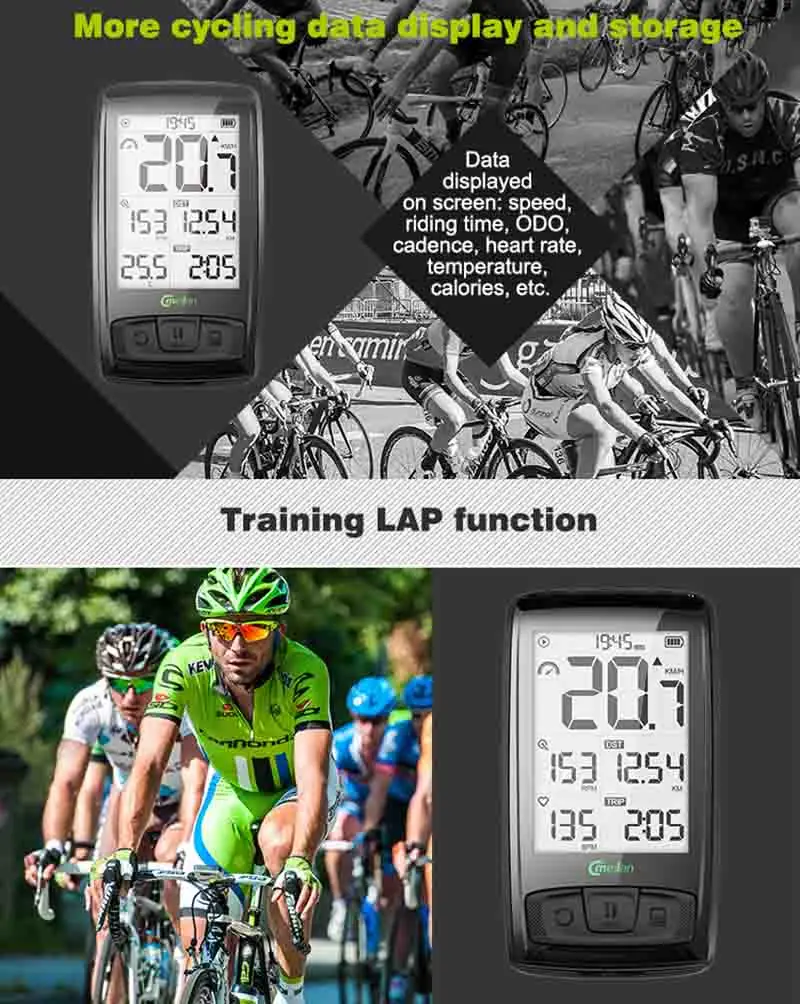 Естественная красота по разумной цене --- рождена для фитнес-тренировок.Первый в отрасли 2,5-дюймов большого размера ILM поверхность экрана, которая была включена в похожее на стекло, чистый и прозрачный. Используйте износостойкий и анти-капля материал, выглядит классно, более практично.Привлекательный дизайн: изогнутая поверхность, предотвращает появление царапин.Отображение и хранение данных на велосипеде: включает ток/Макс/среднее значение скорости, частоты вращения, частоты сердечных сокращений, ODO, расстояние поездки и часы.Обычные режимы езды на велосипеде/коленях, лучше всего подходят для велосипедных упражнений, записи на коленях и функции обзора.00 мАч USB перезаряжаемый аккумулятор, 120 часов работы без подсветки.Аккумулятор датчика: CR2032, сменный.Стандарт: двухканальный датчик скорости/частоты вращения.Два фиксированных способа: свободно фиксируйте его на руле велосипеда или руле. Упрощенный и достойно.Поддержка внешнего датчика сердечного ритма (не включает датчик сердечного ритма).Степень водонепроницаемости: IPX