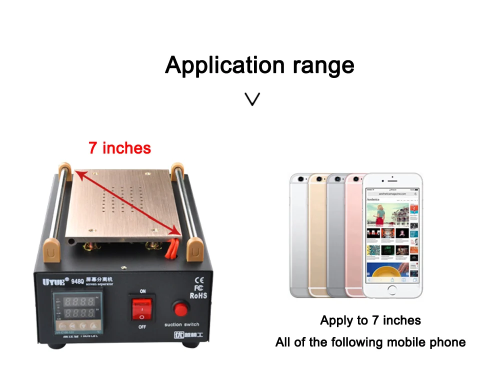 Цвет: черный Напряжение: 110 В/220 В Использование: Сепаратор ЖК-экрана, макс. экран Ремонт: 7 дюймов Мощность: 400 Вт Материал: листовой металл Площадь обогрева: 100*200 Особенности: 1. Встроенный вакуумный насос 2. Материал: листовой металл 3. На UY-100 точный регулятор температуры; 4. Гладкая поверхность нагревательной пластины 5. ЖК-экраны надежно фиксируются на панели 6. Для любых ЖК-экранов 2,5 ~ 7 дюймов 7. Площадь обогрева (мм):100*200 8. Мощность: 400 Вт; 9. Напряжение: 100 ~ 240 В переменного тока; Как использовать: 1. Просто поставьте ЖК-дисплей на нагревательную панель, включите переключатель «вакуумный насос», после чего вы сможете отделить стекло. И ЖК-дисплей надежно фиксируется на панели при разделении. 2. Разделитель ЖК-экрана используется для разделения стеклянных линз, сенсорного экрана и ЖК-дисплея в сборе для Apple, Samsung, HTC, а также других сотовых телефонов. Если вам нужны мыши или другие аксессуары для iPhone 4, iPhone 5, Samsung Galaxy S3, S4, N7100. Пожалуйста, свяжитесь со мной перед размещением заказа. Как и Текущий основной поток сотовых телефонов, Apple, Samsung и HTC, многие новые сотовые телефоны изготовлены из сборки дисплея. Поскольку стеклянные линзы, сенсорный экран и ЖК-дисплей соединены вместе, трудно отделить треснувший или сломанный экран вручную. Всегда приходится брать его в склад для ремонта. Стоимость высокая, а время-долгий. Или вам нужно приобрести дорогопосылка пакет оборудования, включая отдельные машины, машины SMT, ламинирующие машины и машины для удаления пузырьков. Но теперь вы можете справиться с этим легко. Мы разработали машину и навыки, нет необходимости покупать дорогое оборудование и большое пространство для ремонтных мастерских. После освоения навыков вы можете заменить старый экран в течение 3 минут, и он выглядит как новый