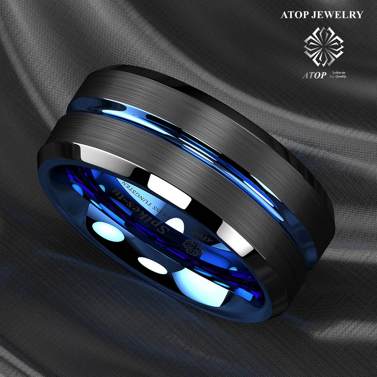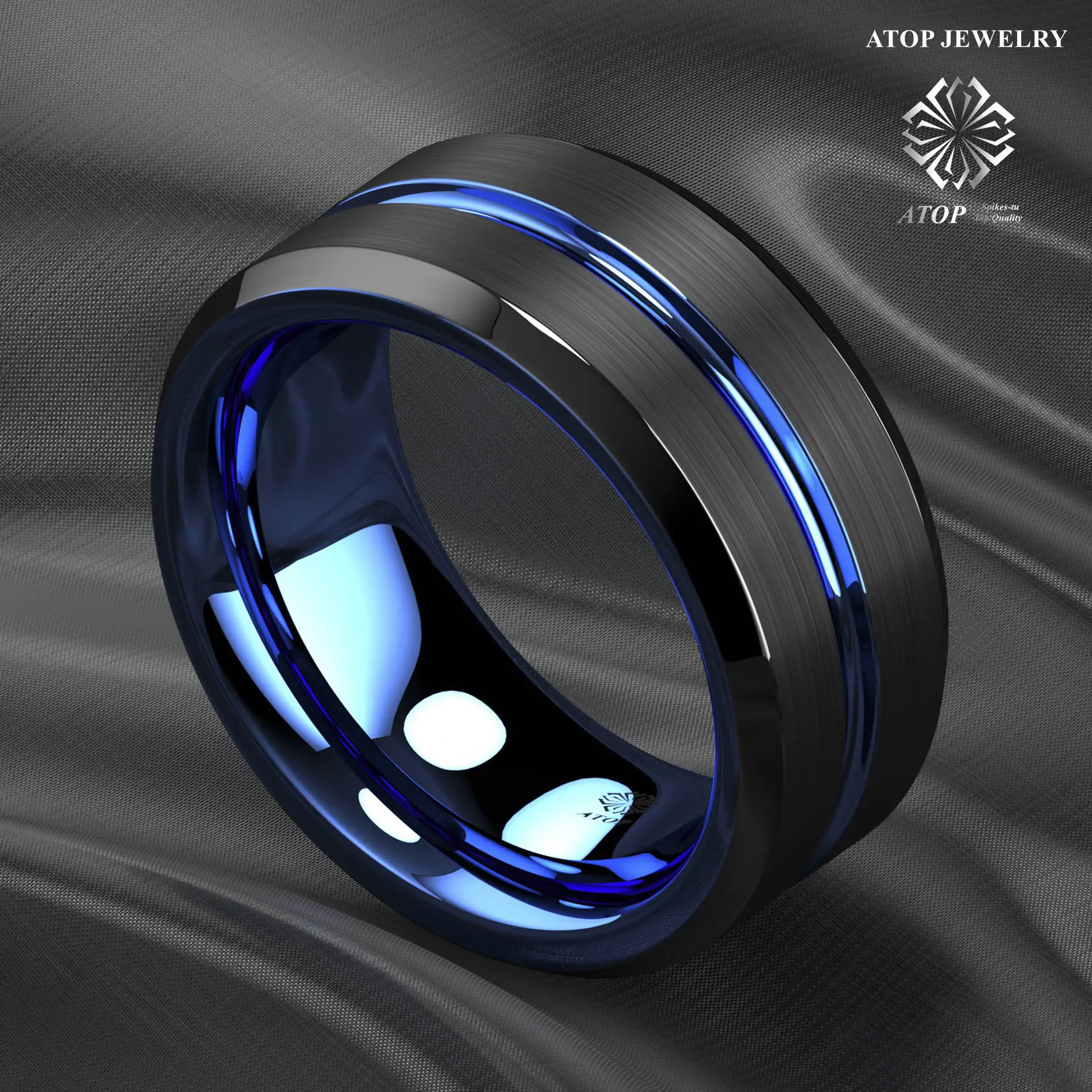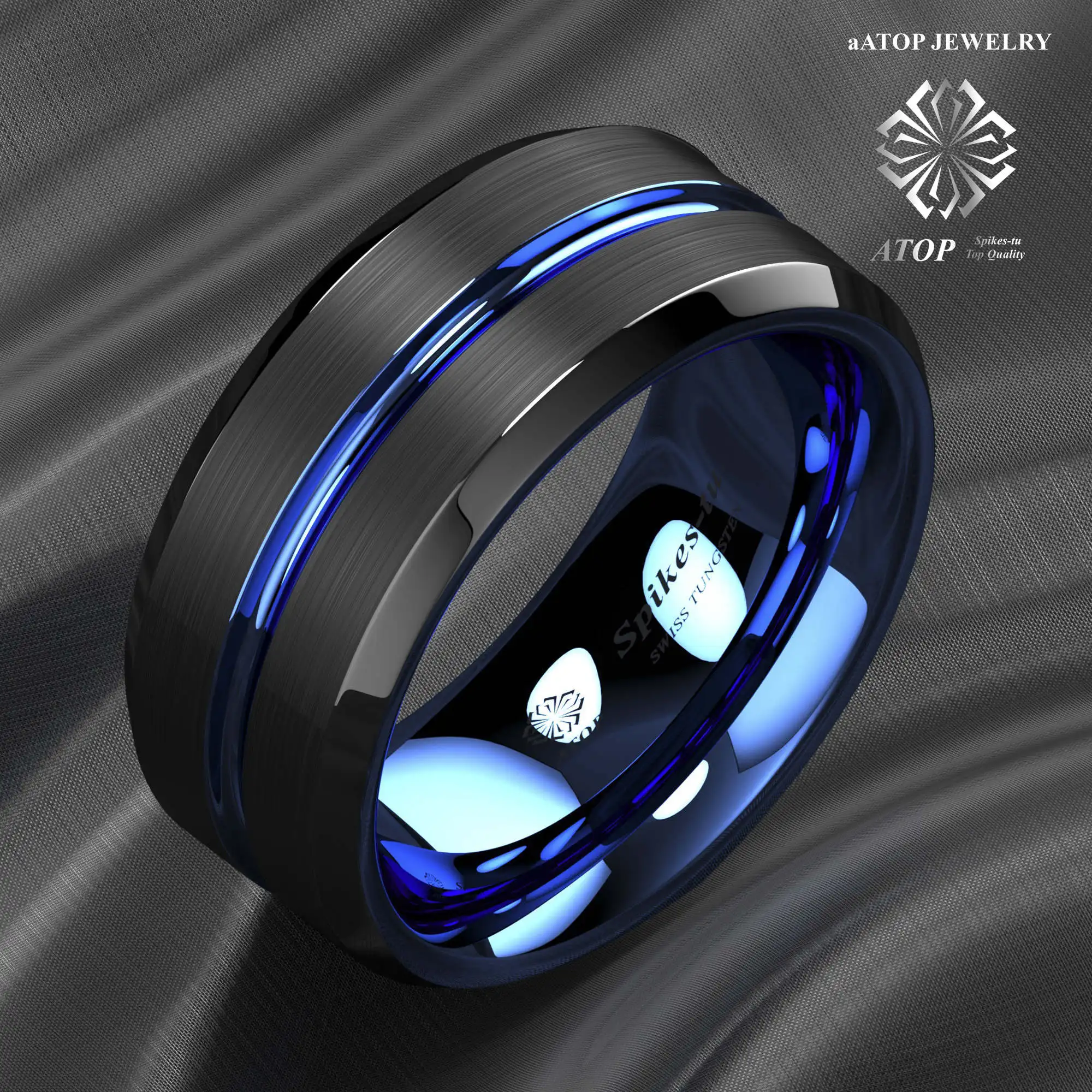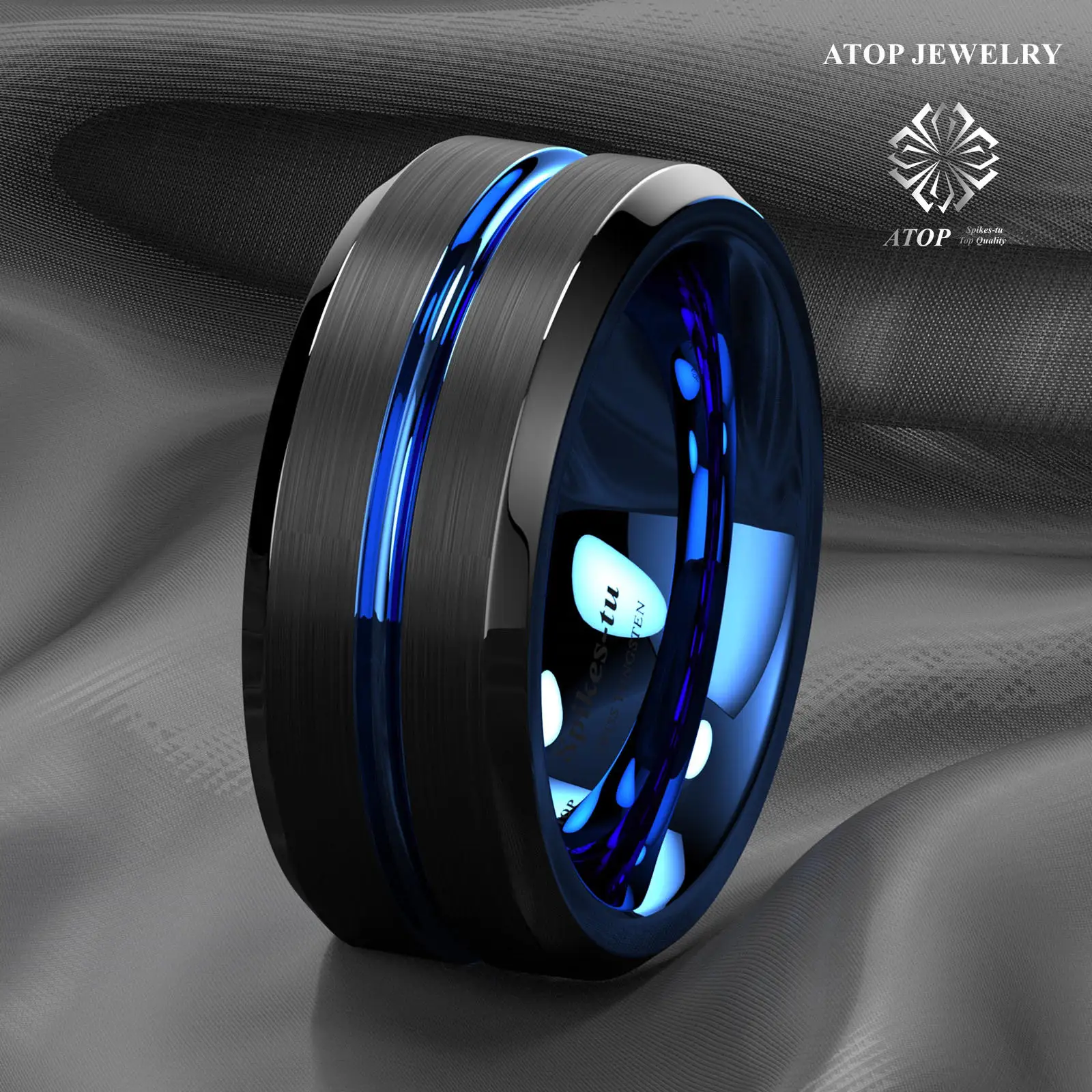Мужское кольцо из вольфрама 8 мм с тонкой синей линией внутри, Черное Матовое кольцо, ювелирные изделия