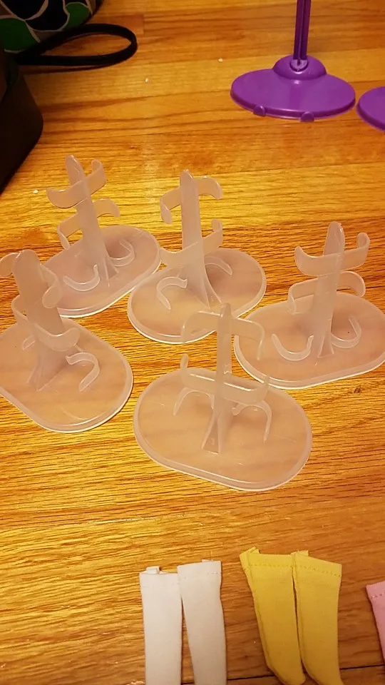 Держатели хороши только для кукол с тонкими ножками и острыми носками, без обуви или очень маленьких туфель. Они не подойдут к кукольной Барби или к туфлям на плоской подошве. С другой стороны, они устойчивы и выглядят красиво.
