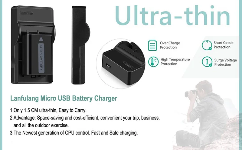 Обратите внимание:Для обеспечения безопасности не заряжайте аккумулятор/зарядное устройство с помощью компьютера, чтобы избежать любых возможных повреждений компьютера от высокой температуры.Usb-порт компьютера в основном поддерживает передачу данных, а не заряжает другие продукты.Преимущество ультра тонкий микро USB камеры зарядное устройство1. Микро Вход: DC 5V; Выход: DC 4,2 V, 500mA2. Размеры: 8,5*4,5*1,8 см (только в том случае, 1,8 см толщина), намного тоньше, меньше Вес.3. Новейшее поколение управления ЦП, микросхема IC, двойная панель PCB, защита от перезаряда, перегрузки по току и перенапряжения.4. Чтобы прорваться через ограничения оригинального режима зарядки зарядного устройства, используя usb-порт для зарядки, он будет более гибким и удобным.5. Преимущество: экономия пространства и экономичность, удобство вашей поездки, бизнеса и всех упражнений на открытом воздухе.Совместимая модель аккумулятора камеры: