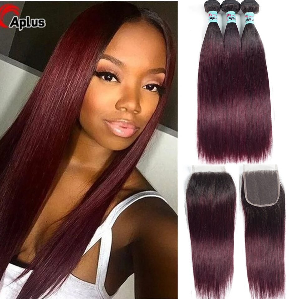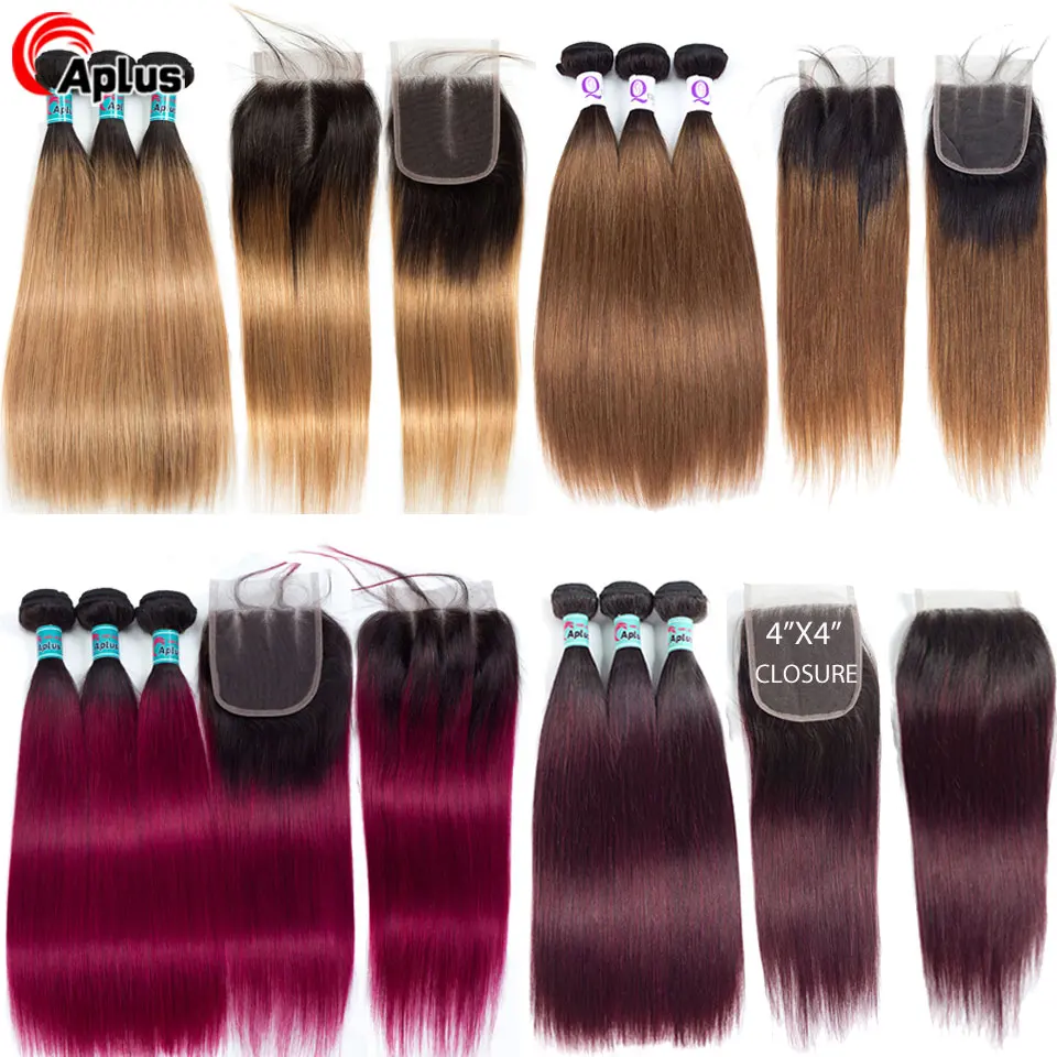 Медовый блонд пряди с закрытием Омбре пряди с закрытием 1b 27/30/99j/бордовый Омбре Прямые Натуральные кудрявые пучки волос пряди Реми