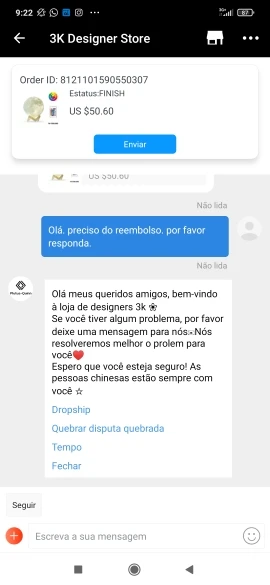 O vendedor não enviou meu produto, e me forneceu um código de rastreamento falso. Entrei em contato várias vezes e ele pediu para aguardar. No último dia da proteção de compra eu abri uma disputa. Então ele pediu para fechar a disputa para que realizasse o reembolso. Eu fechei a disputa e ele não me reembolsou. Agora não responde mais meu contato. Eu até dei a opção para ele.enviar os produtos, que eu aguardaria a chegada. Agora não posso fazer mais nada para reaver meu dinheiro. FUI ENGANADO. Péssima experiência. NÃO RECOMENDO COMPRAR COM ELE.