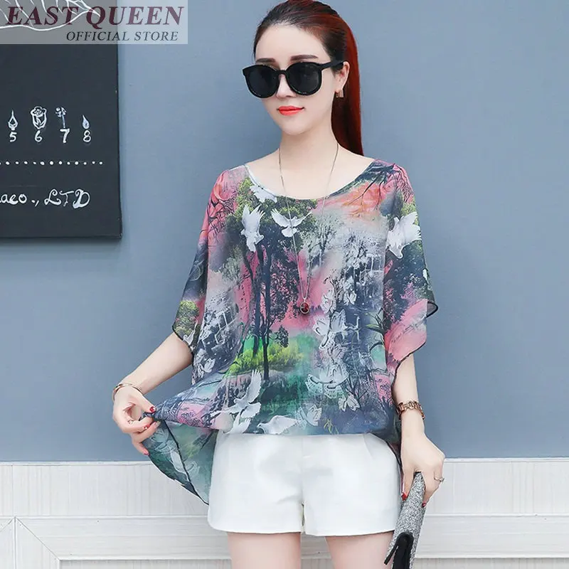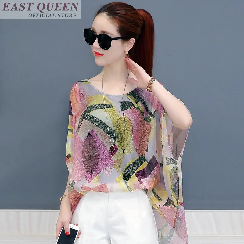 Женская блузка с круглым вырезом, летняя шифоновая блузка с коротким рукавом летучая мышь и цветочным принтом, DD594 L, 2018