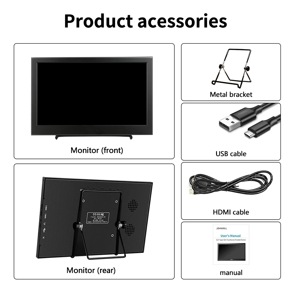 2 посылка металлической подставки:1x11,6 дюймовый ips-монитор 1920*10801 x Кабель питания USB1 кабель HDMI1 металлическая подставка