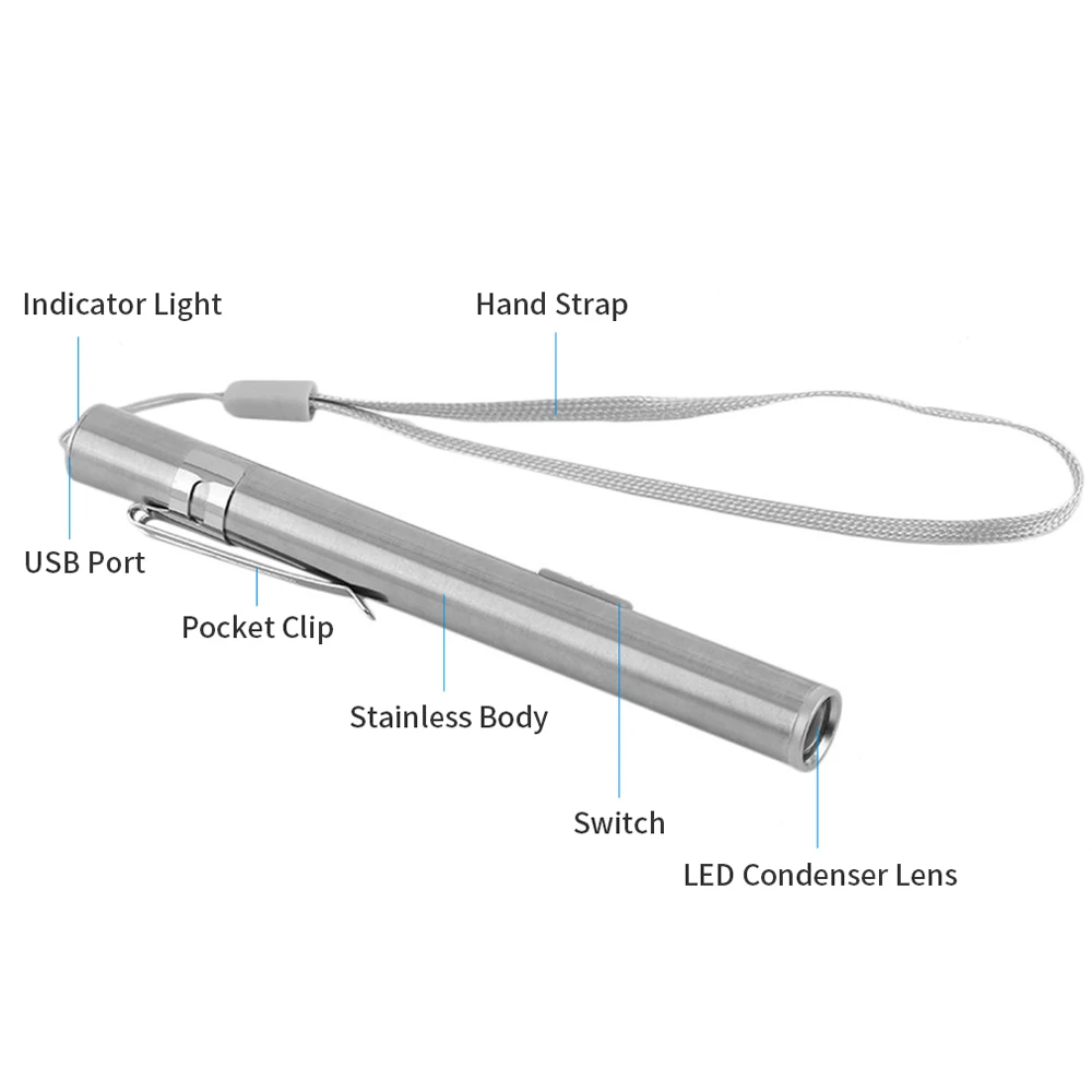 Энергосберегающий портативный профессиональный медицинский удобный светильник-ручка USB Перезаряжаемый мини-светильник-вспышка светодиодный фонарь с зажимом из нержавеющей стали