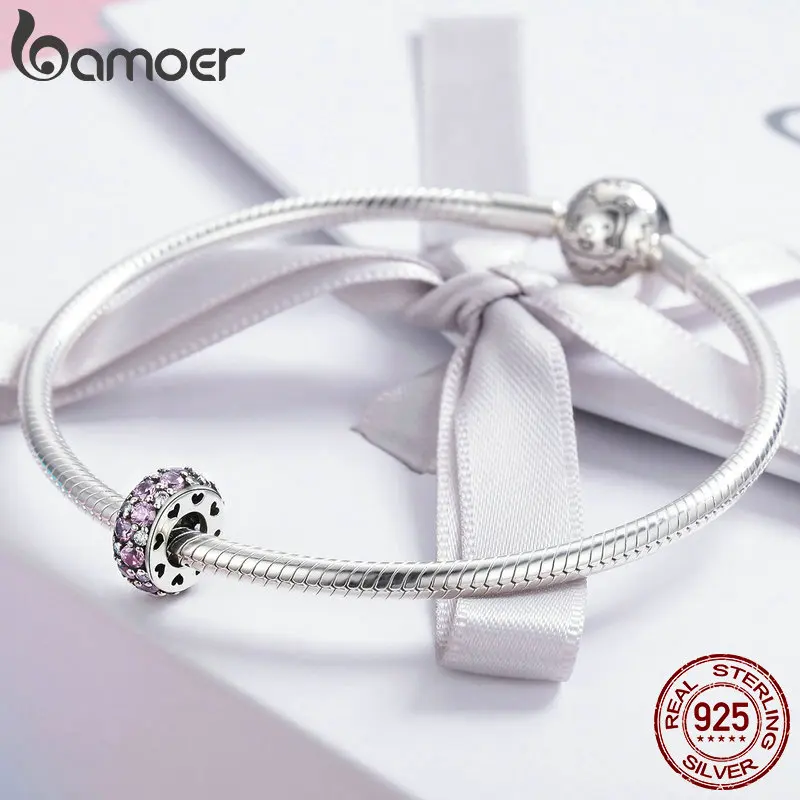 BAMOER новый подлинный классический браслет из стерлингового серебра 925 пробы с розовым кубическим цирконием, очаровательные бусы, браслеты для женщин, сделай сам, ювелирные украшения SCC635