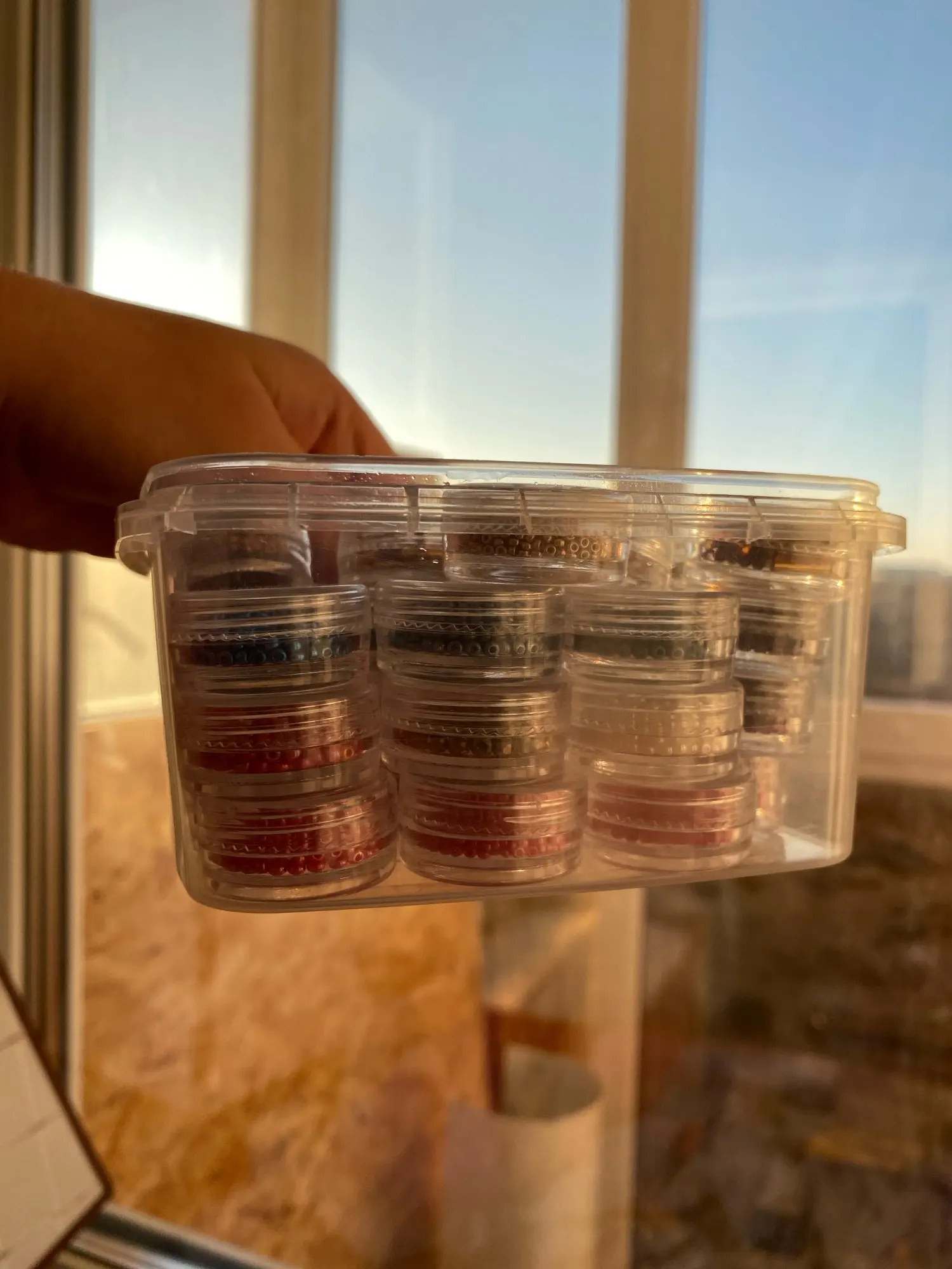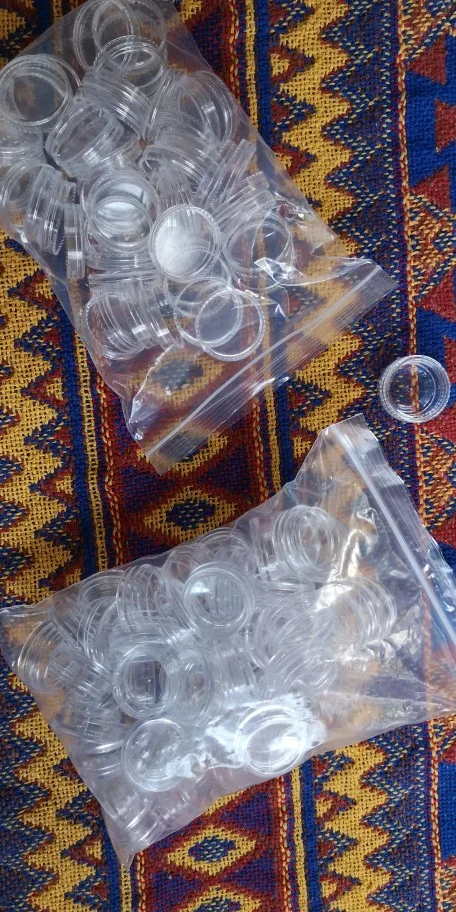 Хорошие баночки, пришло 53 штуки. Для меня немного маленькие, брала под бусины. Но все равно пригодились.