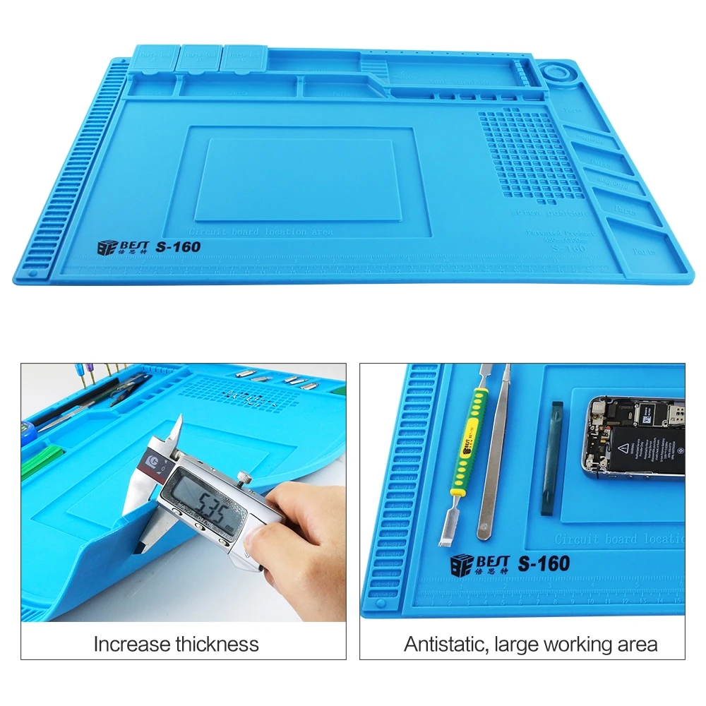Устойчивость к высокой температуре 500 °C. Сепаральные места отверстий для установки винтов, микросхем и мелких деталей. Встроенная линейка шкалы (0 ~ 36 см) на нижнем отделе. Сделайте ваши ремонтные работы легкими. Хороший партнер для пистолета горячего воздуха. Только небольшая секция магнитится (отмечена на подушке) и может использоваться для крепления винтов. Он немного слабый, не так сильный магнит.