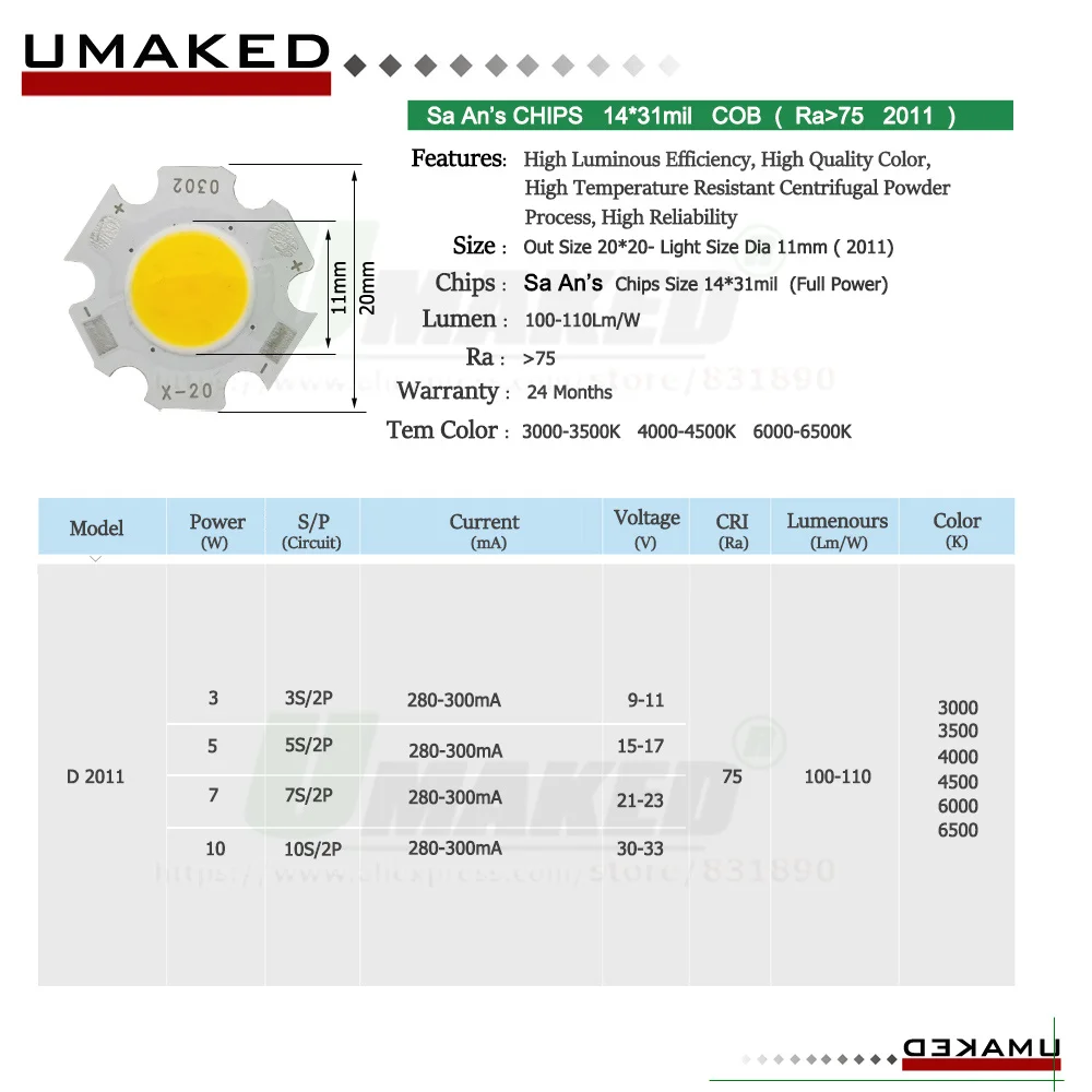 Светодиодный чип высокой мощности COB 3 Вт, 5 Вт, 7 Вт, 10 Вт, D20 ...