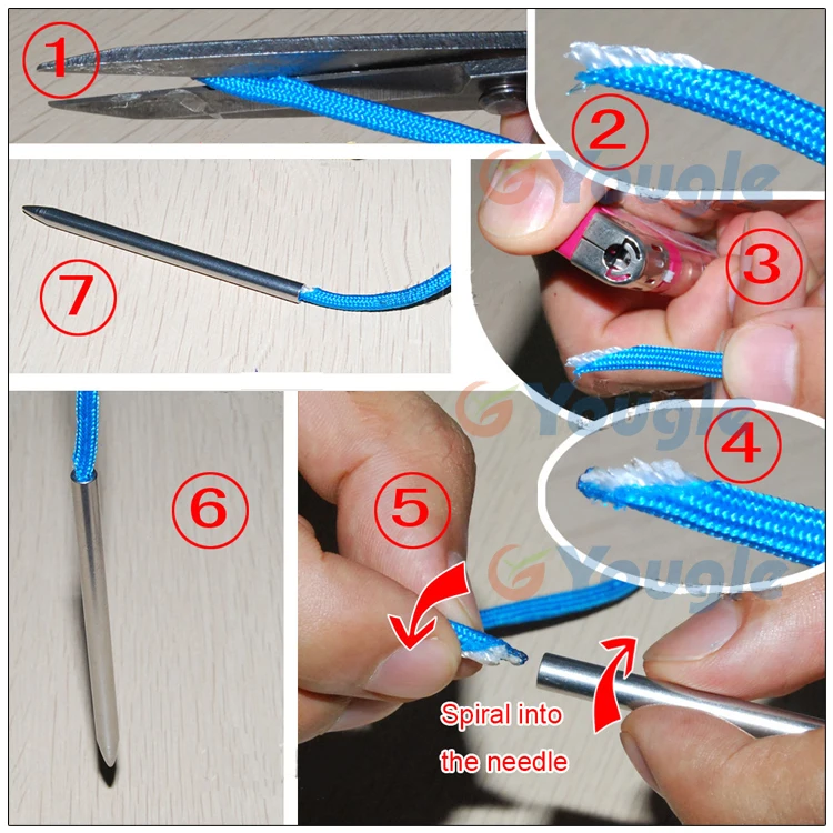 Чтобы прикрепить Паракорд от игла для шнуровки до 550, Просто отрежьте Паракорд под углом 45 градусов или Разрежьте его в стрелку. Затем Растопите конец и Сверните Его, чтобы образовалась удлиненная точка. Нажмите эту точку в задней части иглы и поверните игла для шнуровки по часовой стрелке. Внутренняя нить игла для шнуровки вкусит в Паракорд и удерживает его на месте.