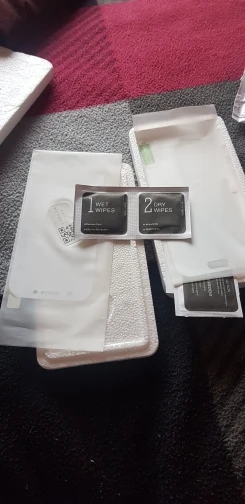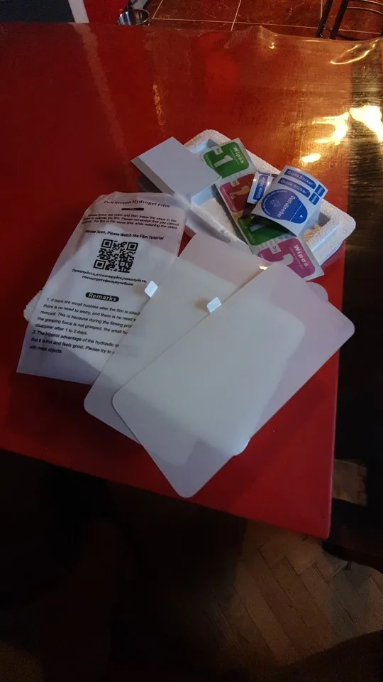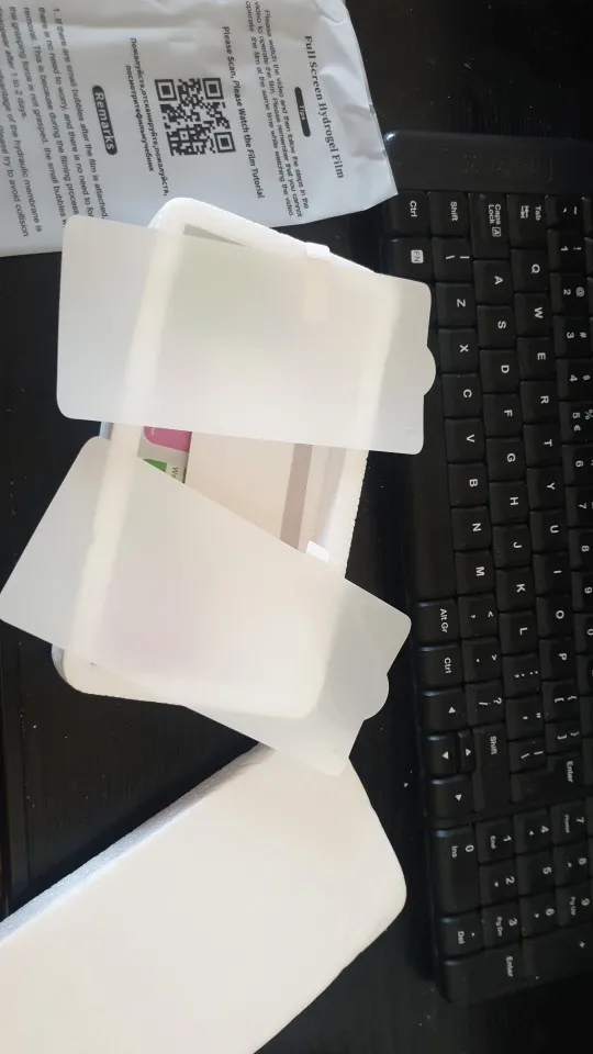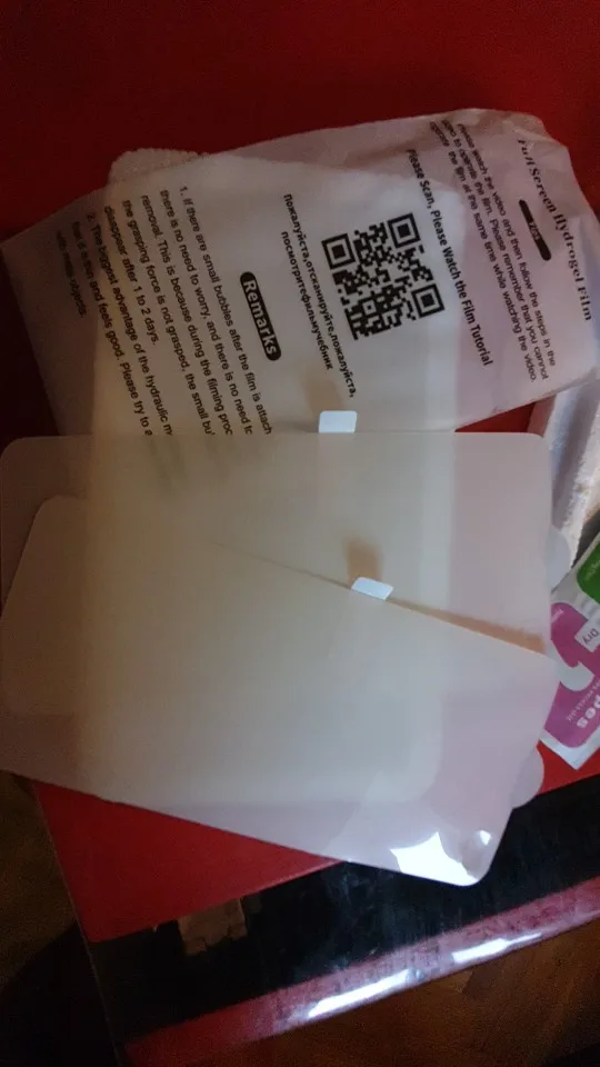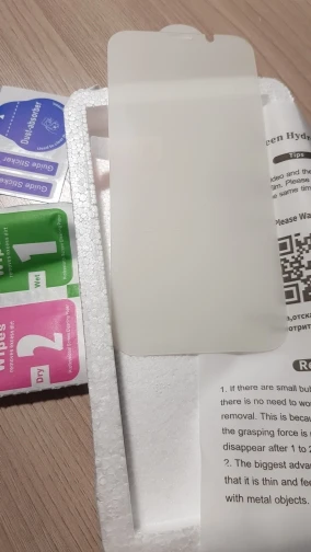 в упаковке (пенопласт) пришло 2 пленки. с салфеточками и qr-кодом с инструкцией как наклеить пленку. первую испортила, вторую успешно без косяков наклеил. удобно и приятно на ощупь, чуть вязкая поверхность.