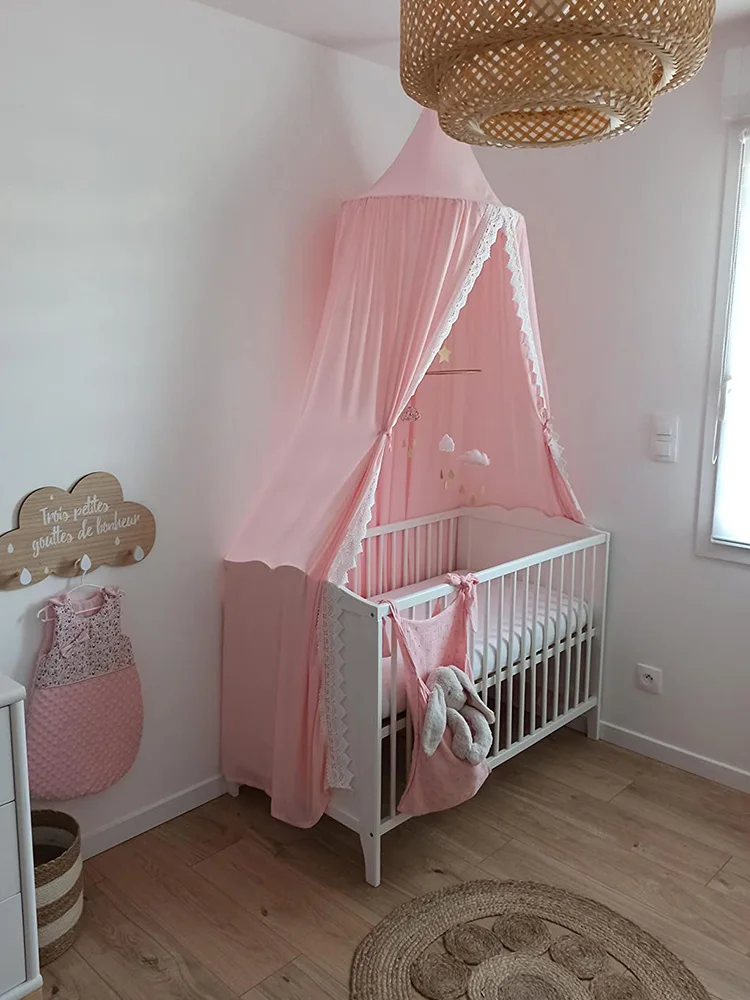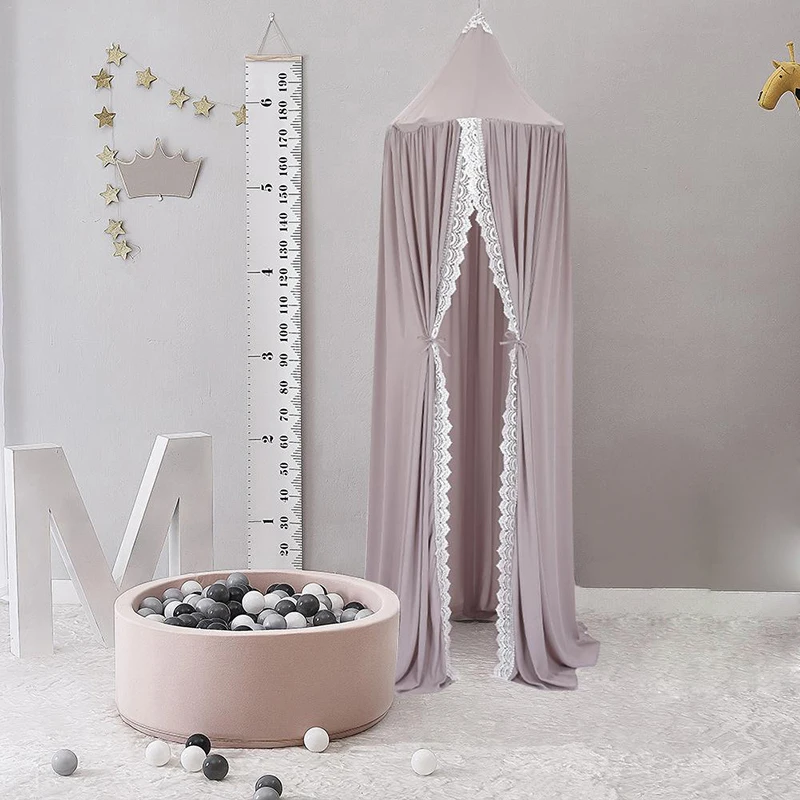 Круглая детская кроватка с кружевом, розоваябелаясерая