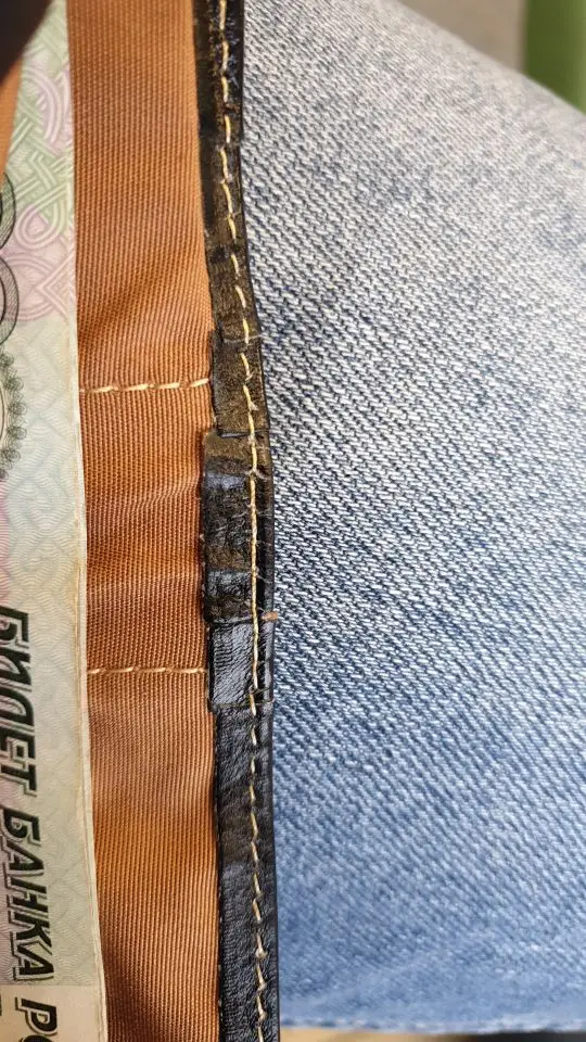 Молодёжный кошелёк. Своих денег стоит. Замок не мешает, в кармане сидит удобно. Миниатюрная модель. Российские рубли помещаются в притык. С наружи кожа обработана краской, что не соответствует снимку продавца.