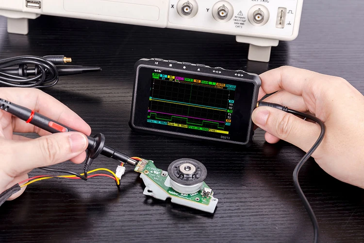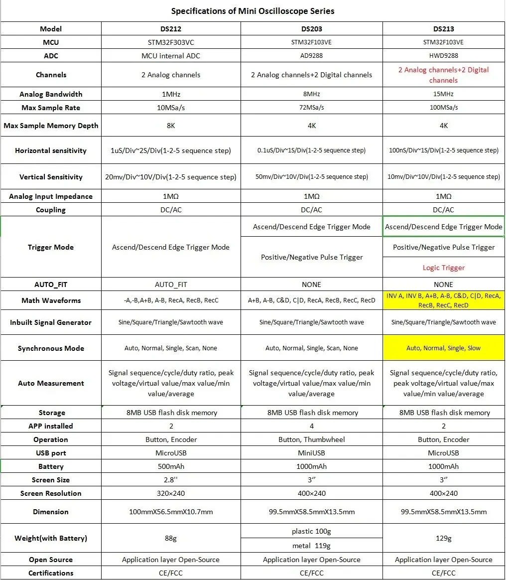 DS213-это «5-канальная, 4-волновая линияЦифровой запоминающий осциллограф для общего назначения электронных инженерных задач и он основан на ARM Cortex M3 core. DS213 использует FPGA для управления внешним контролем ADC и режимом кэша данных. Он предоставляет 4 раздела приложений для загрузки и обновления до 4 различных прошивок приложений. Он также имеет встроенный USB-накопитель 8 Мб для хранения волновых форм и обновления прошивки системы. Прикладной слой кода осциллографа является открытым исходным кодом, и пользователи могут разработать прошивку осциллографа в соответствии со своими потребностямиОсобенность:Миниатюрный размер светильник вес, портативный и портативный;