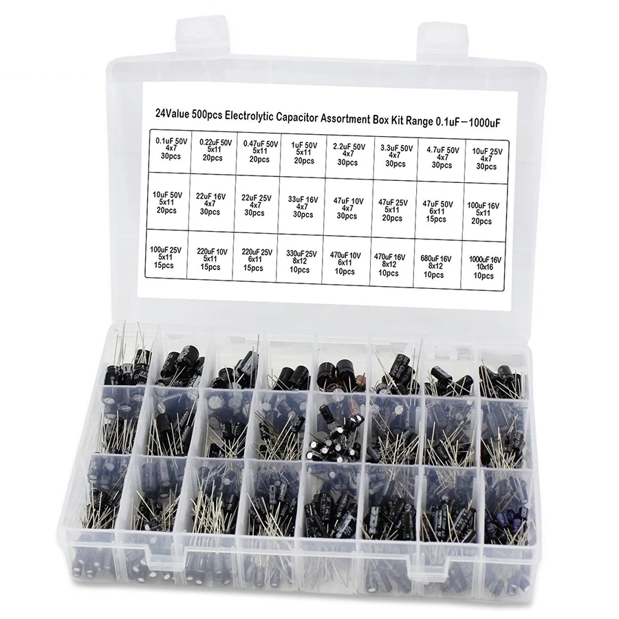 электролит конденсатор 500 шт.лот 10 в 16 в 25 в 50 в 0,1 мкФ Ф-1000 мкФ из алюминиевый электролитический конденсаторы набор ассортименте ,24 видов конденсатор набор конденсаторов