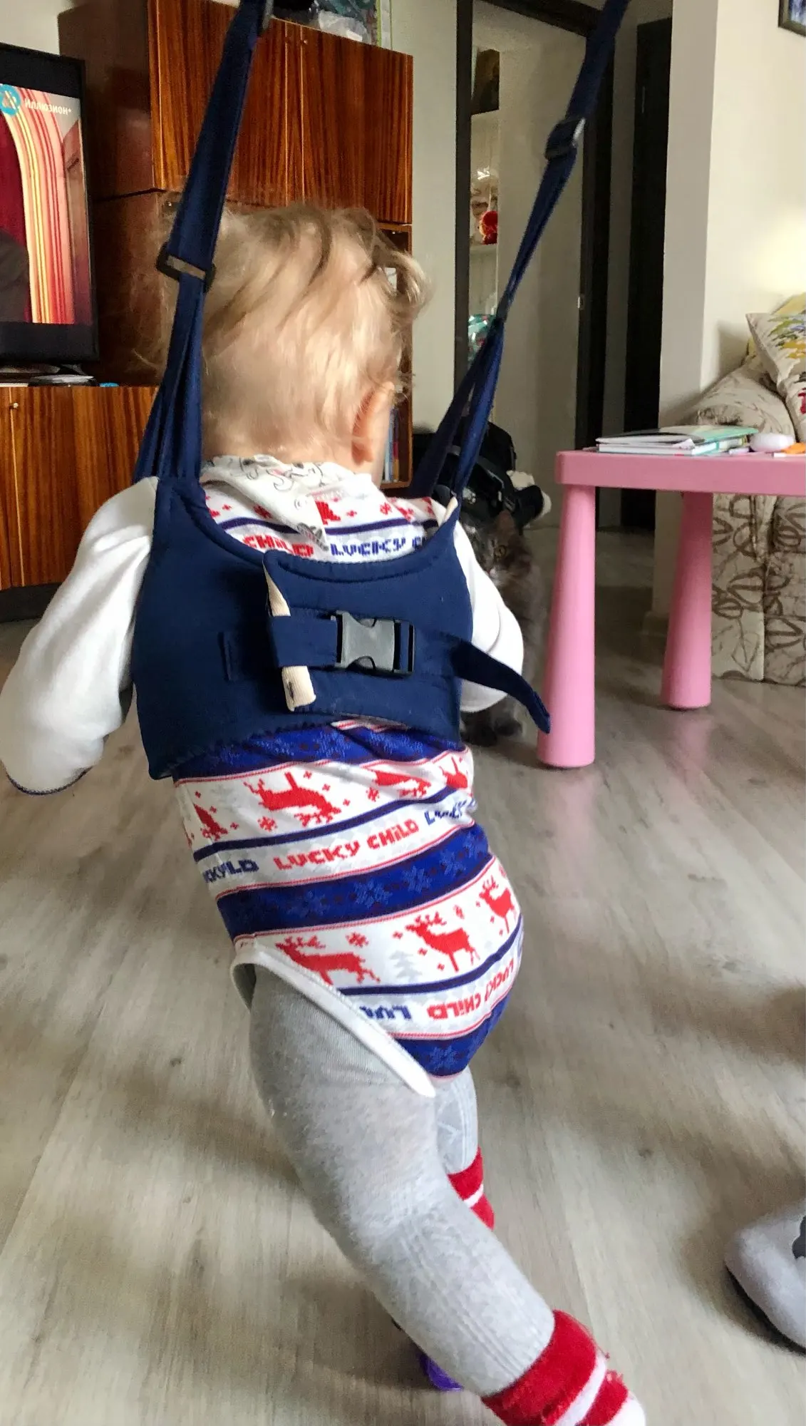 вещь очень полезная на то время, когда ребёнок только начинает ходить самостоятельно. благодаря ей не нужно постоянно ходить за ребёнком в наклон (спина стала меньше болеть и уставать). и всегда можно вовремя предотвратить падение. Супер!