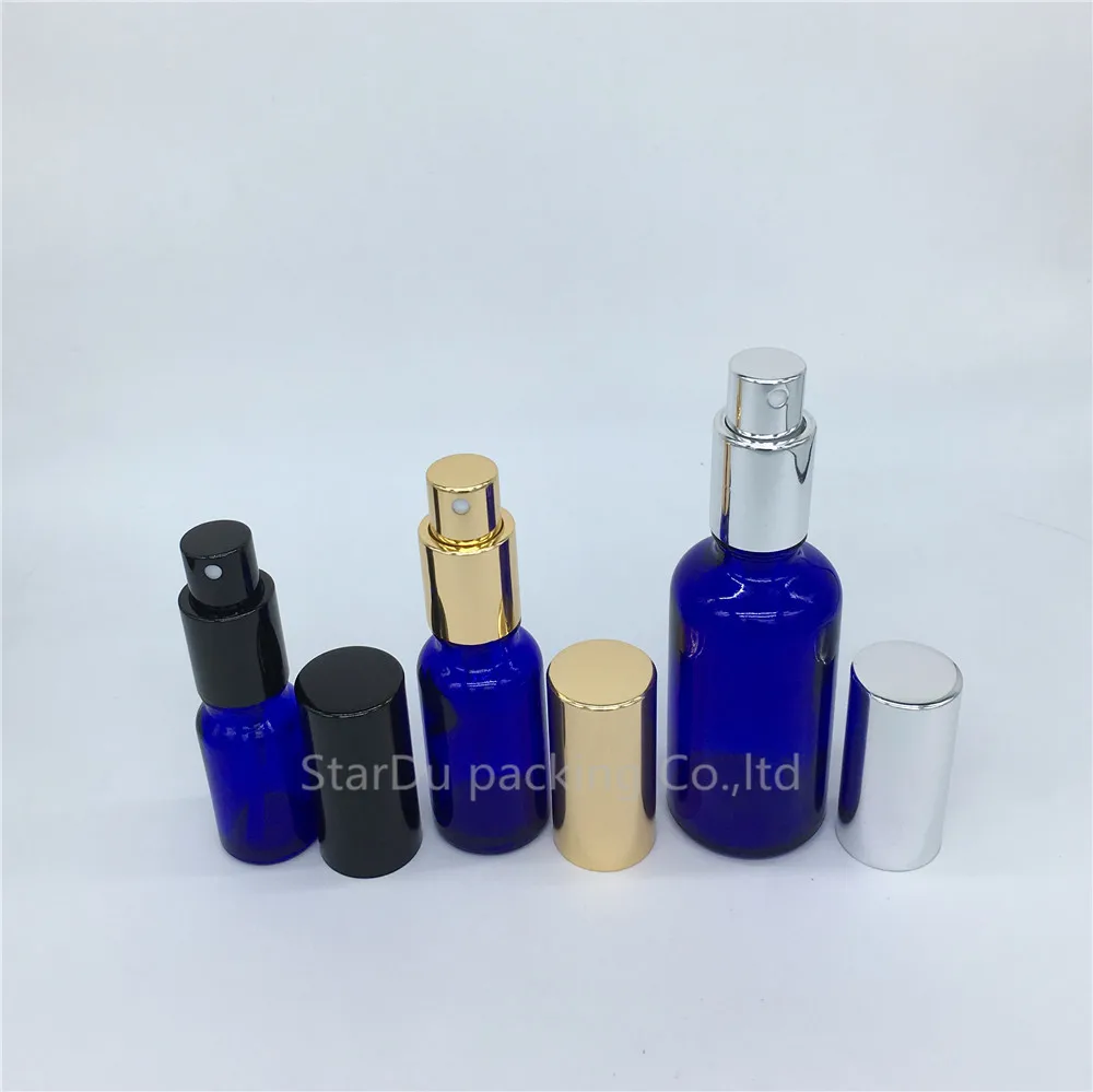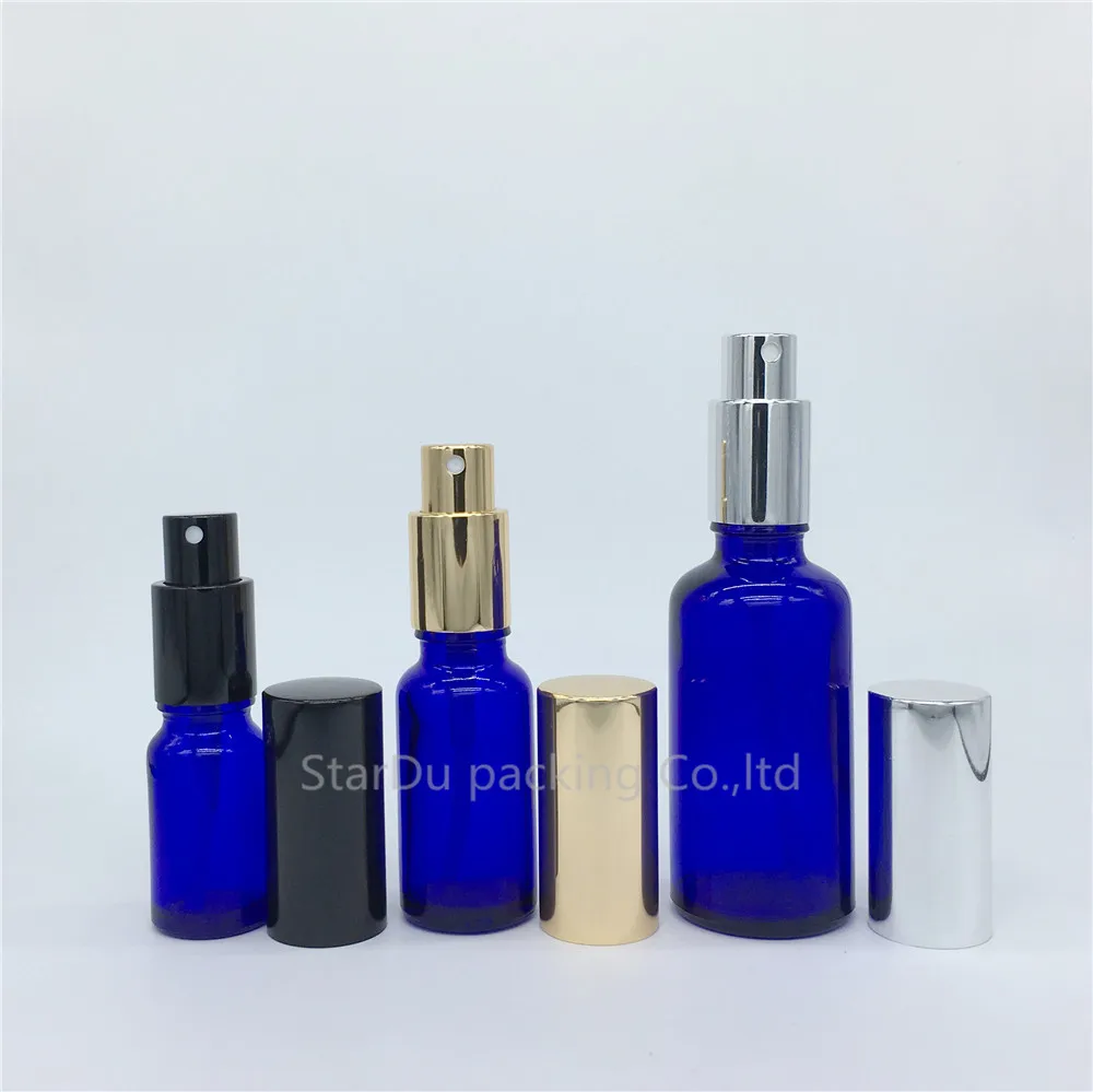 10 мл 15 мл 20 мл 30 мл 50 мл 100 мл синяя стеклянная бутылка с парфюмом Алюминиевый распылитель, стекла для распыления эфирного масла Синие бутылки 500 шт.