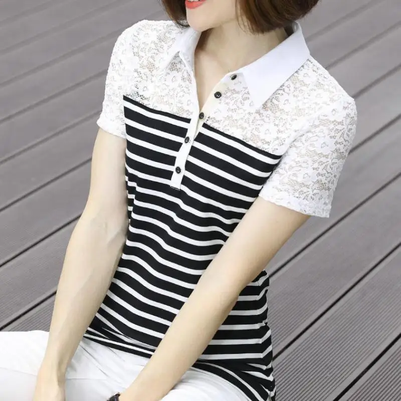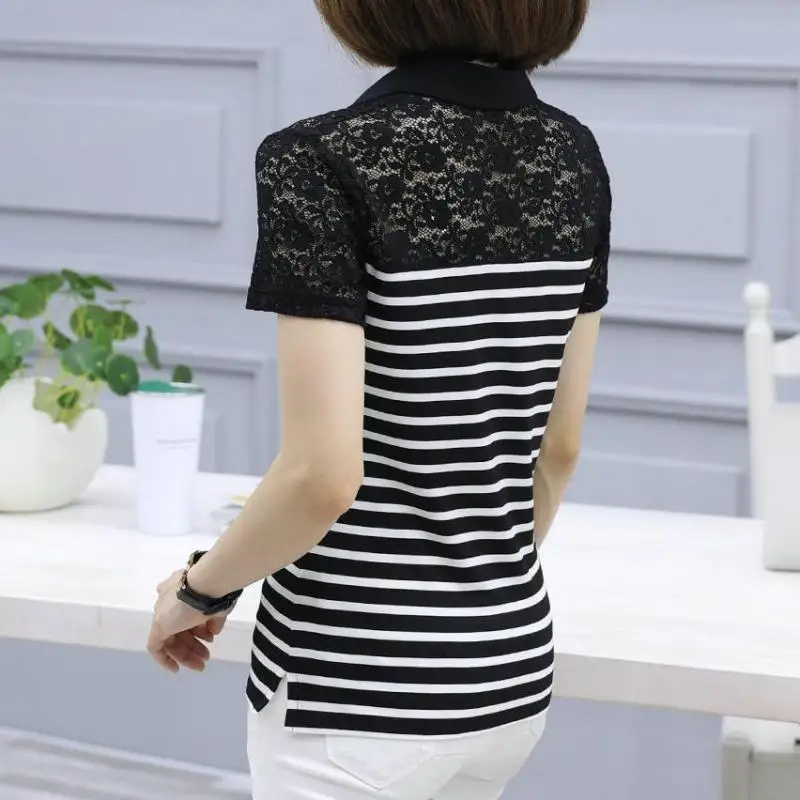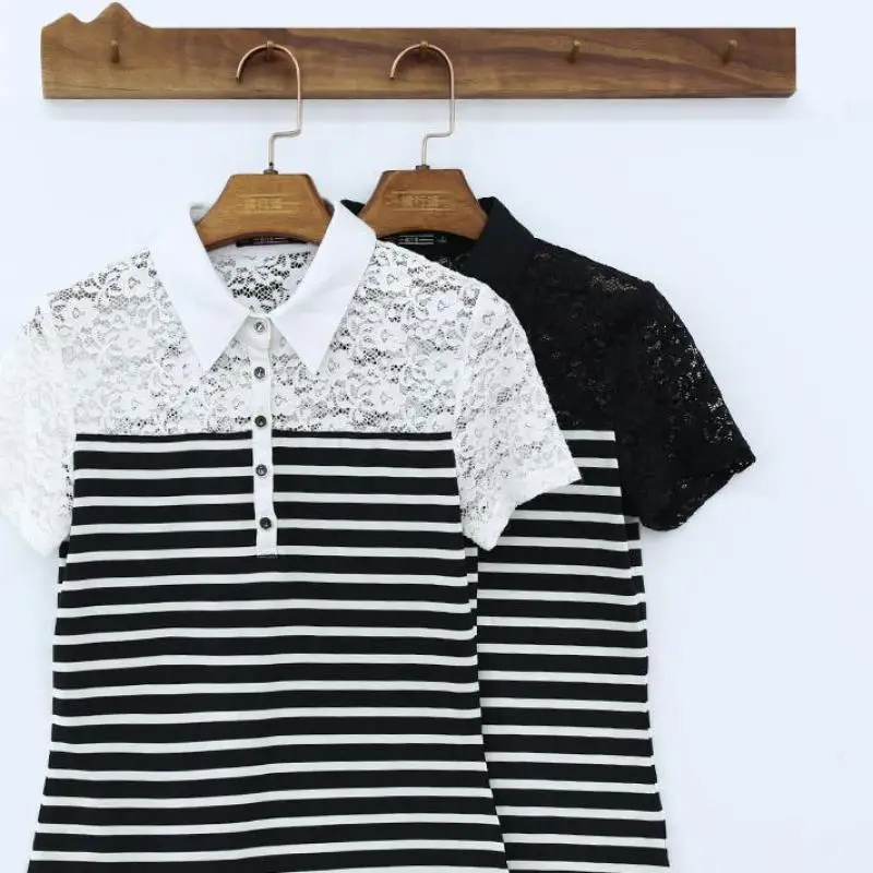 Женская футболка с коротким рукавом, летний яркий хлопковый топ в полоску с кружевом, Y86