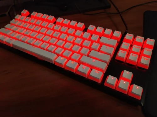 Посылка ехала долго, больше 2-х месяцев. Скорее всего, из-за коронавируса. Качество хорошее, на ощупь намного приятнее обычных ABS. С подсветкой смотрятся великолепно. Заказывал версию для TKL, однако отправили еще и нампад. И пару дополнительных клавиш, на которых символы регулировки звука. Заказом доволен, могу советовать как приемлемые недорогие PBTшки.