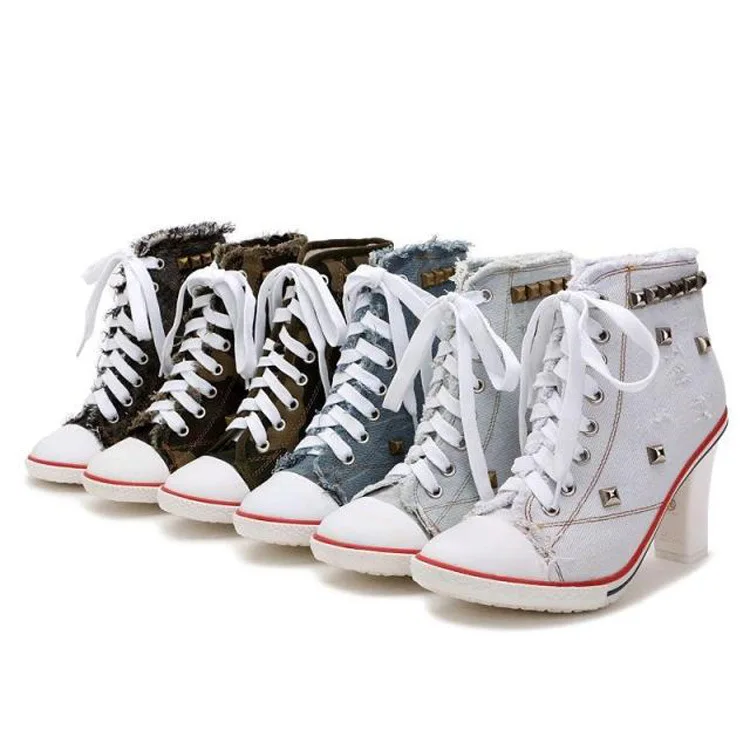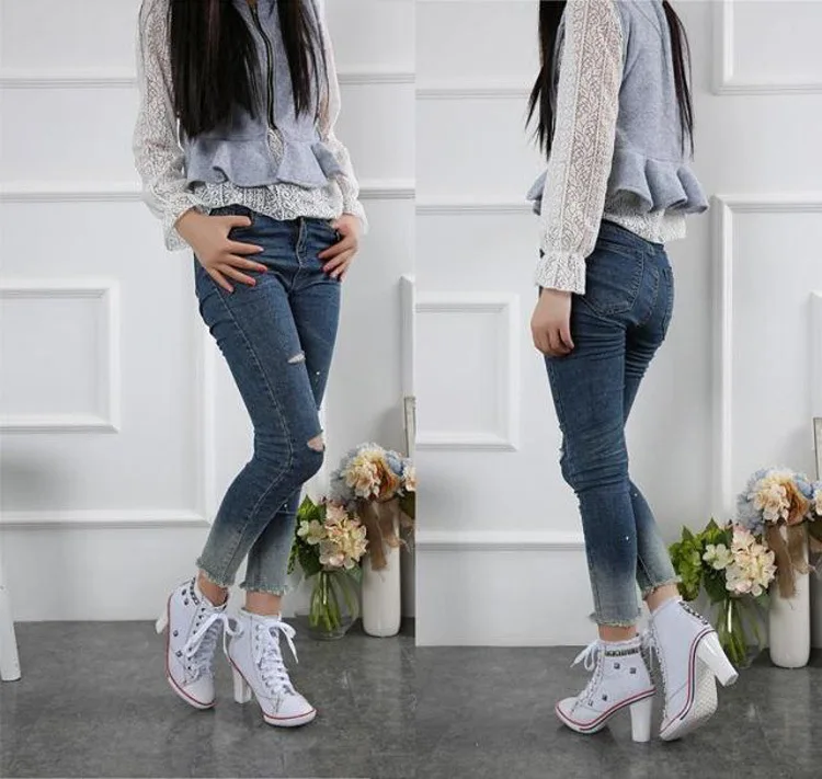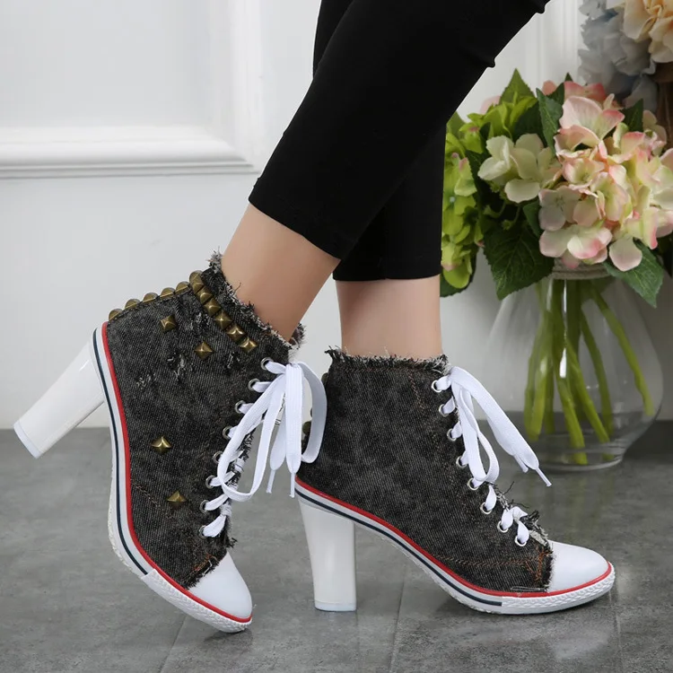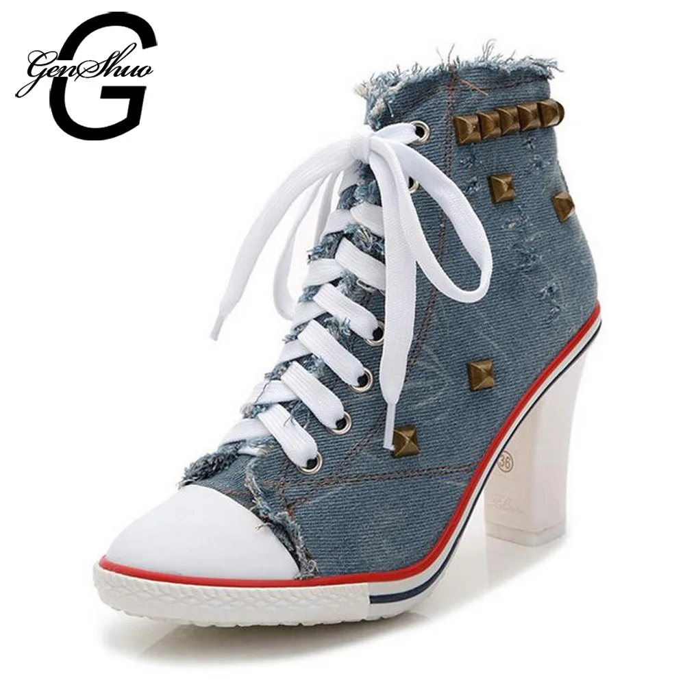 GENSHUO Демисезонные женские короткие джинсовые ботинки с острым носком и заклепками в стиле панк 2019 модные повседневные женские джинсовые ботильоны на массивном высоком каблуке