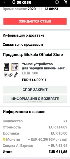 Потерял более двух месяцев на ожидание посылки, но так и не дождался её. ((( Продавец написал мне, что она, дескать, пропала во время транспортировки, но что-то я очень сомневаюсь в этом. Скорее всего товар, из-за скидки АлиЭкспресс и низкой стоимости в итоге (€ 11.85), вообще не был мне отправлен. На это продавец в чате ничего не ответил. Открыл спор и магазин молча вернул деньги. М-да... Сейчас зарядник продаётся здесь за € 18.40 ‼️ ((