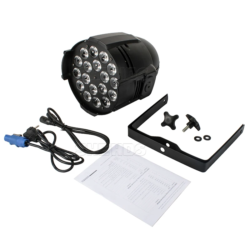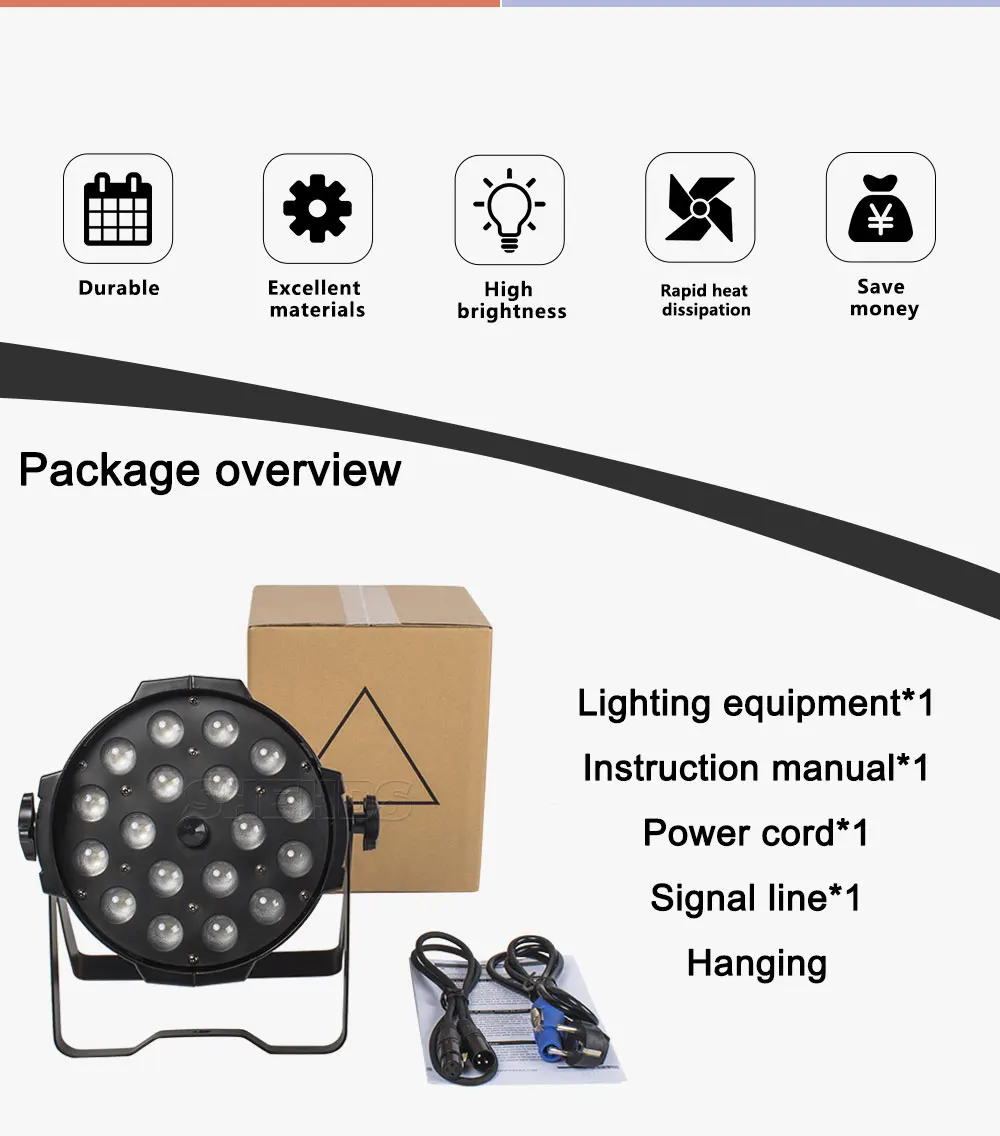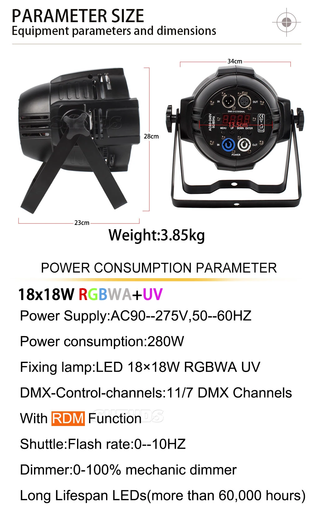Входное напряжение: AC90--240V,50-60 ГцПотребляемая мощность: 324 ВтСветодиодный источник: 18x18 Вт RGBWA + УФ-красный, зеленый, синий, белый, янтарный, фиолетовый и смешанный цветDMX-Каналы управления: 10 каналов DMXРежимы работы: DMX512, автозапуск, звуковое действие, стробоскоп, автономный и мастер/раб, с богатыми передовыми встроенными программами.Диммер: 0-100% механический диммерДлительный срок службы светодиодов: более 60000 часовУровень защиты: IP20 в помещенииСтруктура материала: алюминиевый корпус