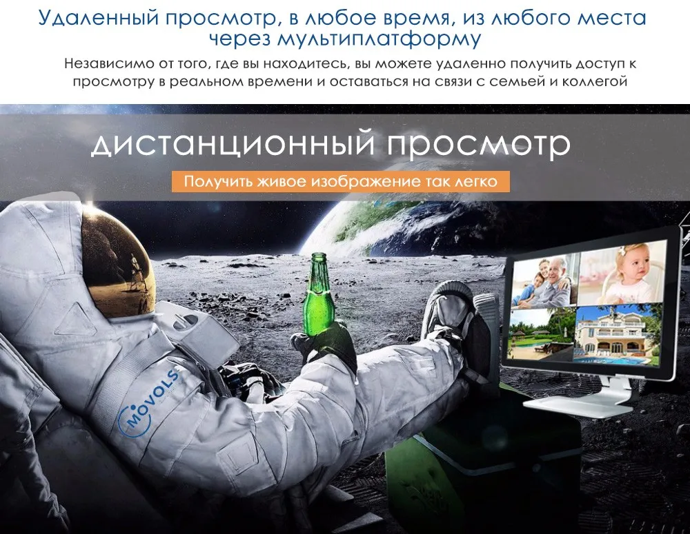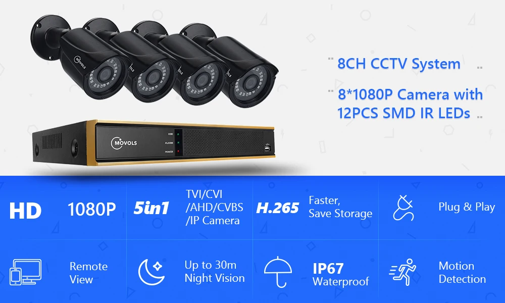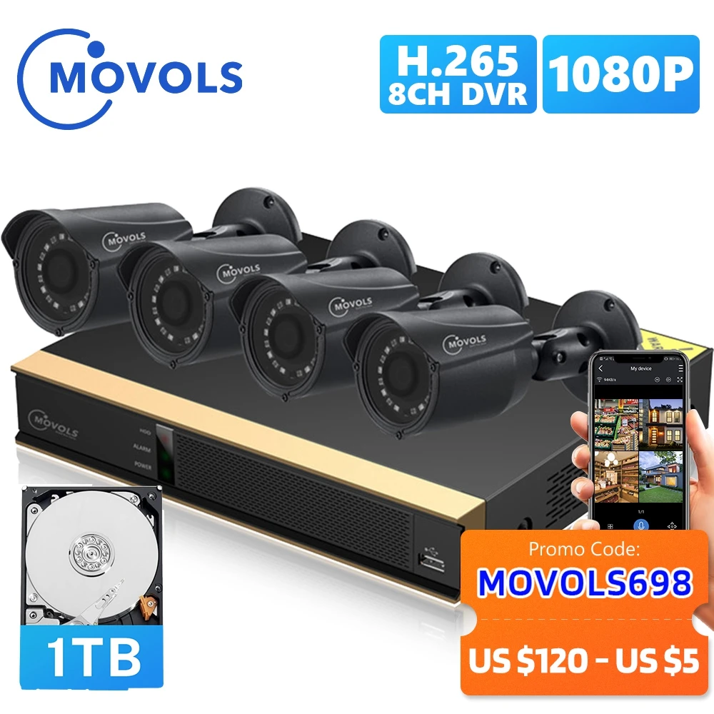 Система видеонаблюдения Movols, 8 каналов, с ии, 4 камеры 2 Мп, для наружной защиты от непогоды, DVR, H.265, домашняя система видеонаблюдения