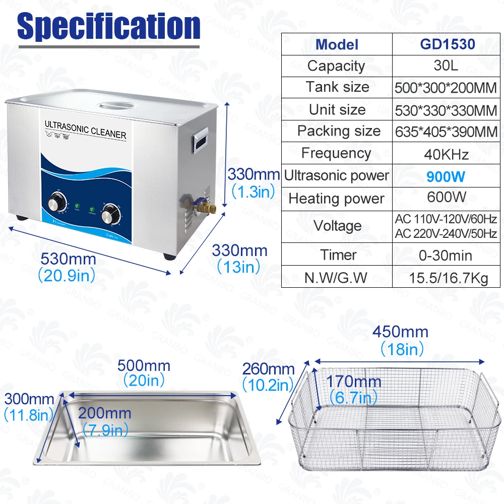 Встроенные мощные преобразователиМожет усилить мощность ультразвука и обеспечить превосходный результат очистки. ЭтоИспользование цифровой программыВ ультразвуковом очистителе для управления устройством, в зависимости от количества и состояния очищаемых предметов, чтобы выбрать время рабочего цикла. В результате этоБолее удобный и эффективныйЧем ручная стирка, пароочистители, Водоструйная очистка высокого давления или другие машины.