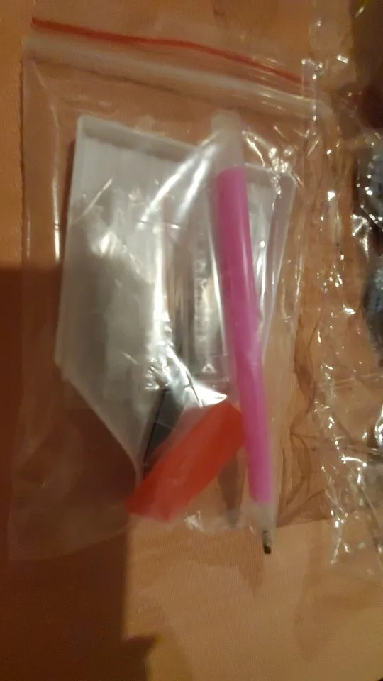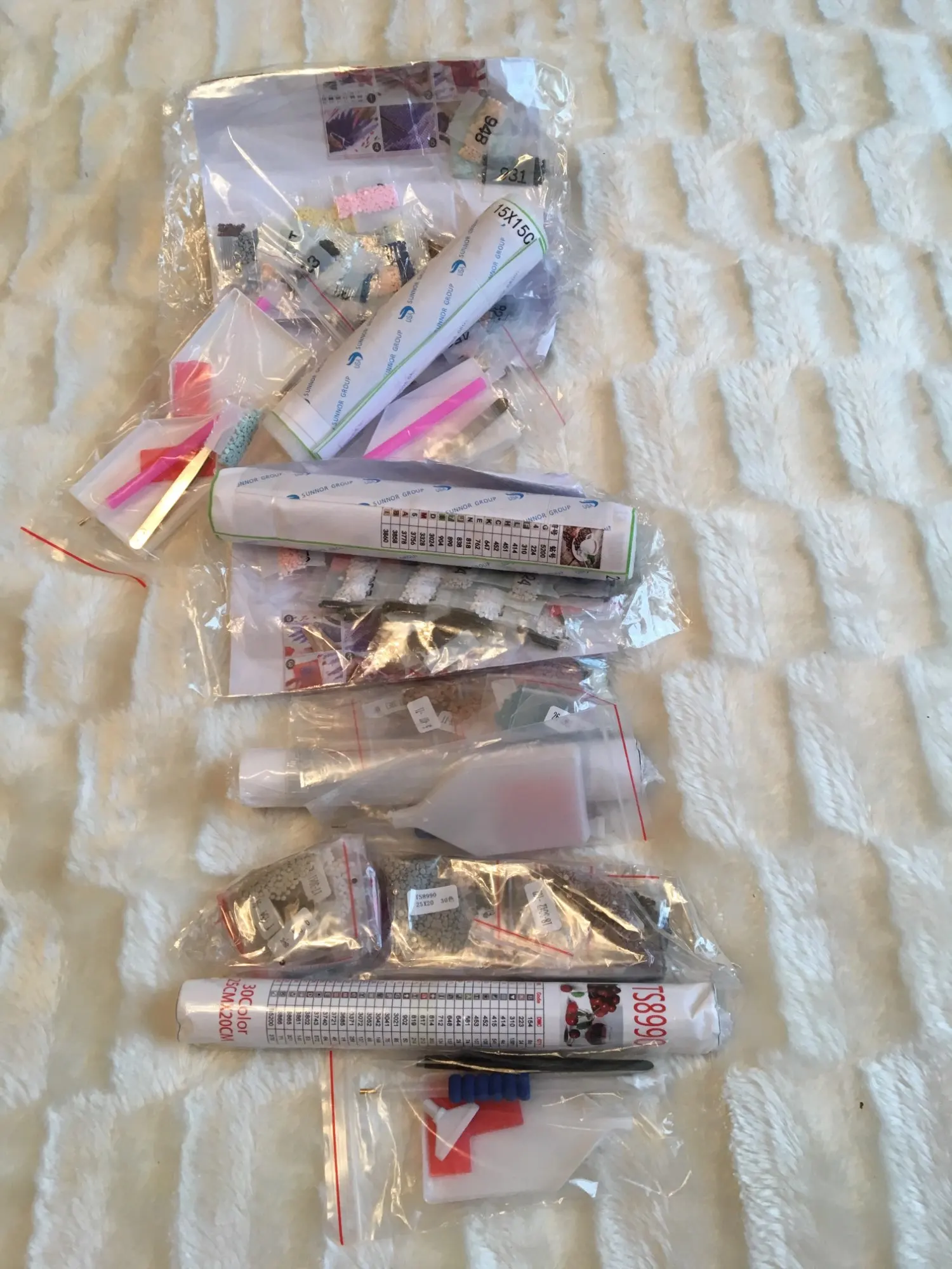 Item exactly as described. Ordered on 12/23, received on 01/14, so, very happy about that. Comes with complete kit, and quite a lot of diamonds. I will update after, if the diamond are enough or not. Neatly packed in a box. Very happy with this purchase. Thank you so much.