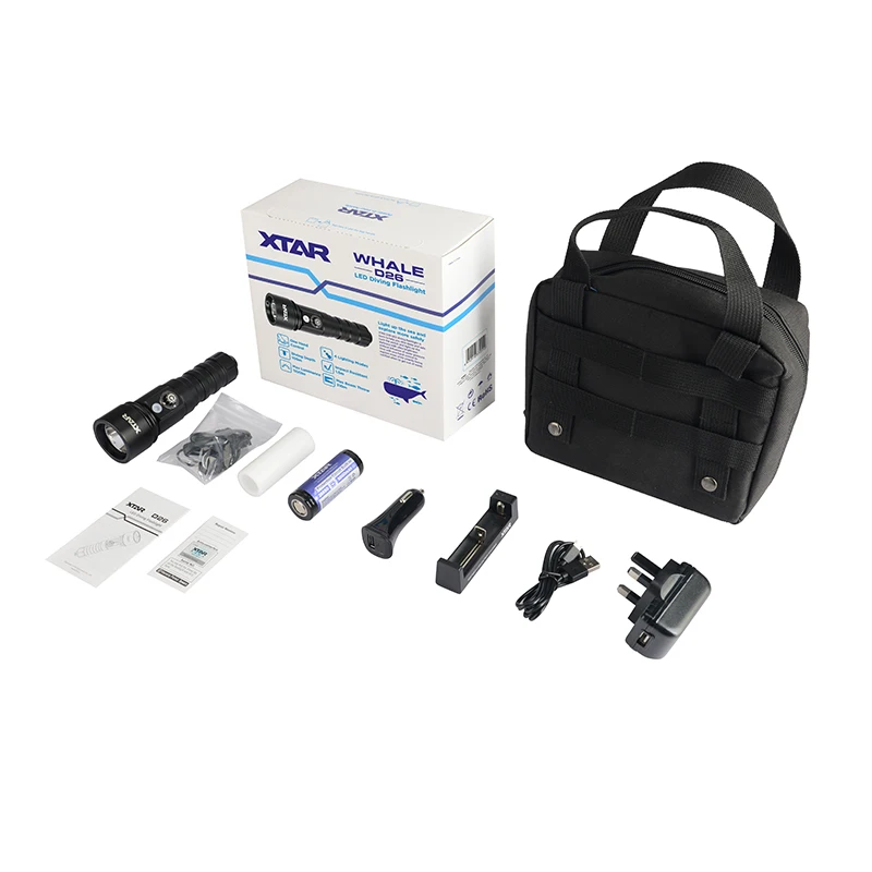Как профессиональный фонарик для дайвинга, XTAR D26 использует новейший Премиум CREE XM-L2 U3 LED с макс. 1100lm. Отличная функция герметизации достигает 100 метров глубины погружения. Вы можете выбрать режимы, включая Режим High-Turbo-Mid-Low. Индикация мощности будет возражать, если заряда батареи достаточно. Когда емкость батареи выше 25%, светодиодный индикатор горит зеленым цветом; Емкость батареи падает на 5%-25%, светодиодный индикатор горит красным; Емкость батареи падает ниже 5%, светодиодный индикатор мигает красным цветом. С аккумулятором большой емкости 18650 или 26650 D26 позволяет вам долгое время погружения.